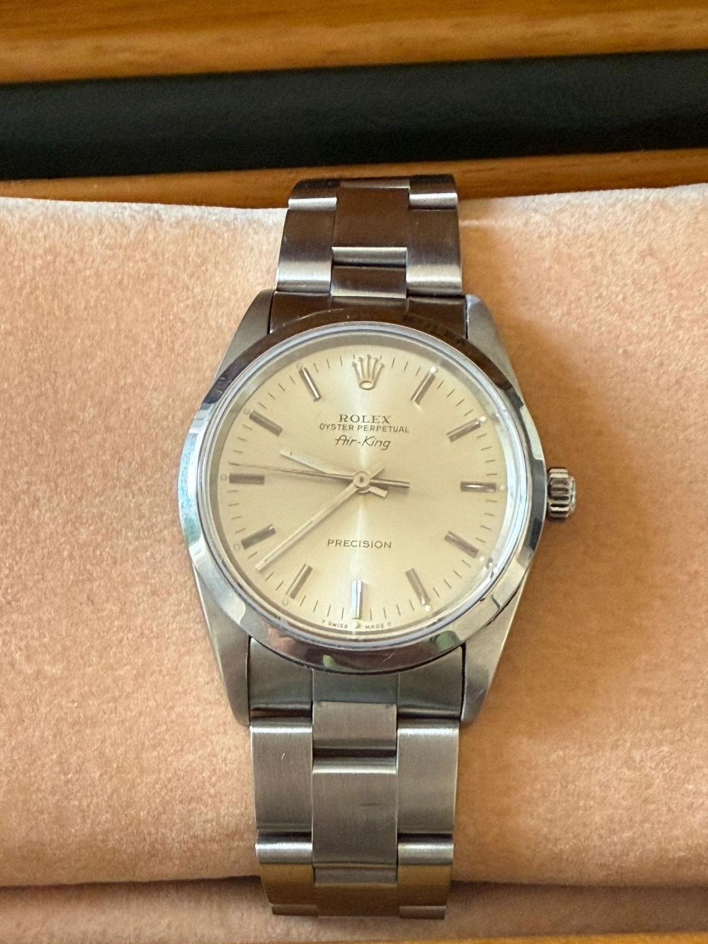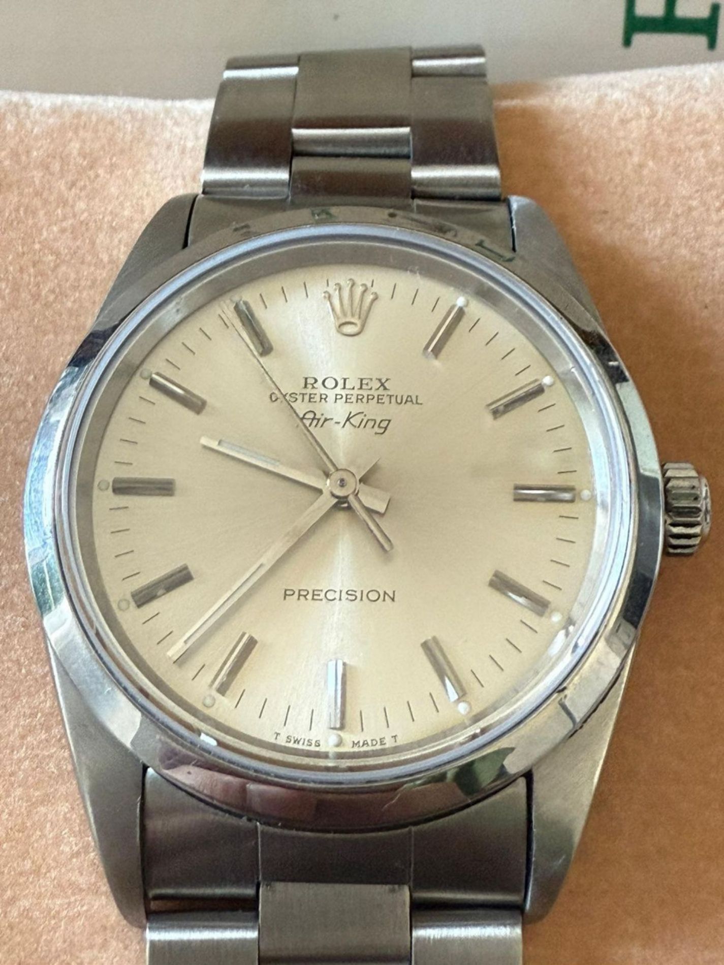 Marca Rolex Modello (Orologio) Air King Numero di referenza 14000 Carica Automatico Materiale della cassa Acciaio Materiale cinturino Acciaio Anno 1993 Condizione Ottimo (di seconda mano, segni di usura assenti o appena visibili) documenti originali, no box Carica Automatico Cassa Materiale della cassa Acciaio Diametro 34 mm Impermeabile 10 ATM Materiale lunetta Acciaio Vetro Vetro zaffiro Cinturino Materiale cinturino Acciaio Colore cinturino Acciaio Chiusura Déployante Materiale chiusura Acciaio - COMMISSIONE D’ASTA 25%