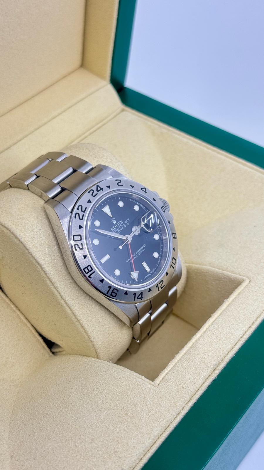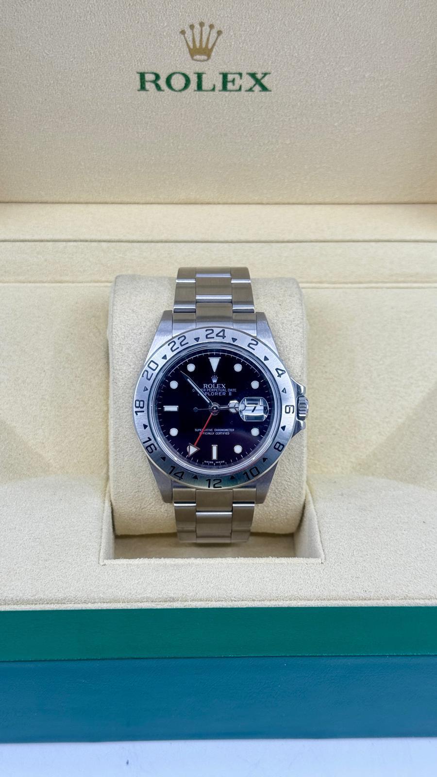 Marca Rolex Modello (Orologio) Explorer II Numero di referenza 16570 Carica Automatico Materiale della cassa Acciaio Materiale cinturino Acciaio Anno di produzione 2008 documenti originali Rolex, no box Calibro Carica Automatico Calibro/Meccanismo 3186 Materiale della cassa Acciaio Diametro 40 mm Impermeabile 10 ATM Materiale lunetta Acciaio Vetro Vetro zaffiro Quadrante Nero Cinturino Materiale cinturino Acciaio Colore cinturino Acciaio Chiusura Déployante