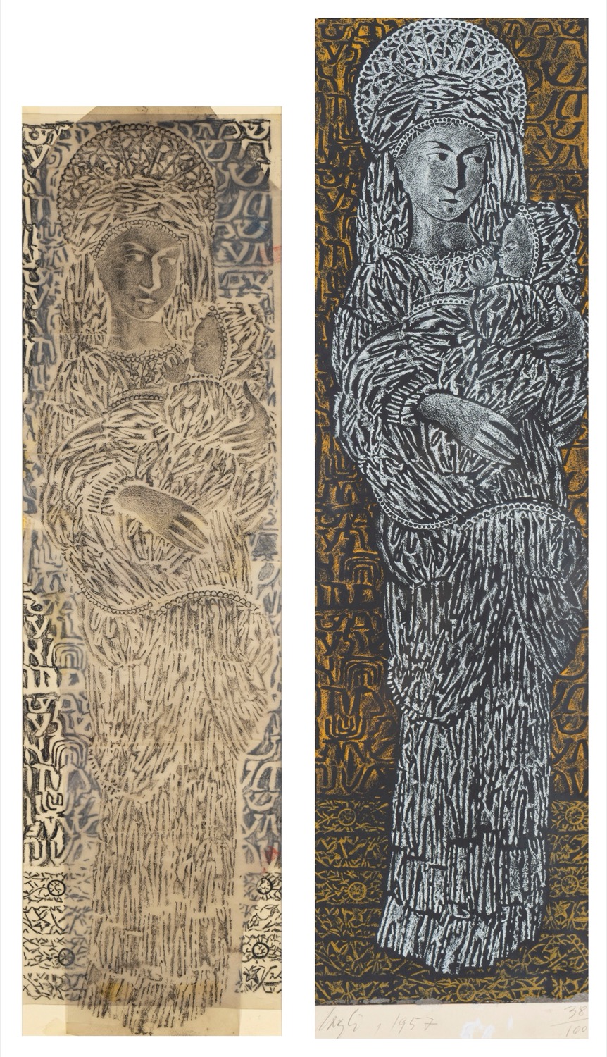 Firma e data a matita in basso a destra a) Madonna con Bambino, 1957