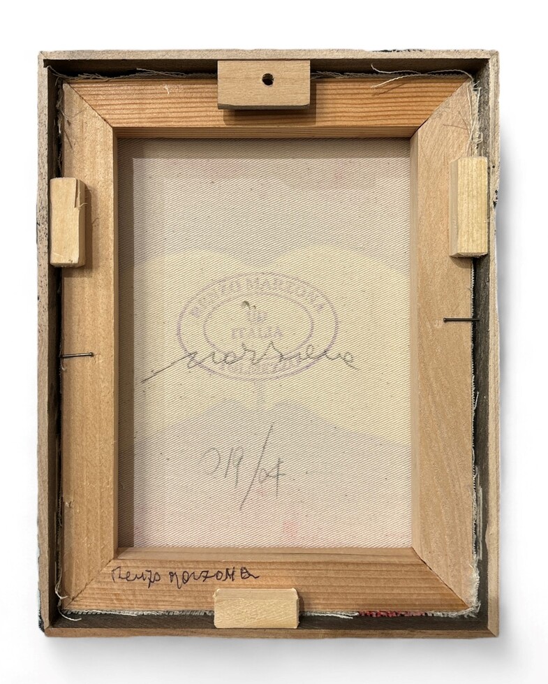 tecnica mista su tela 20 x 15,5 cm Firmato sul telaio. Timbro e firma al retro della tela. In cornice con vetro a righe.