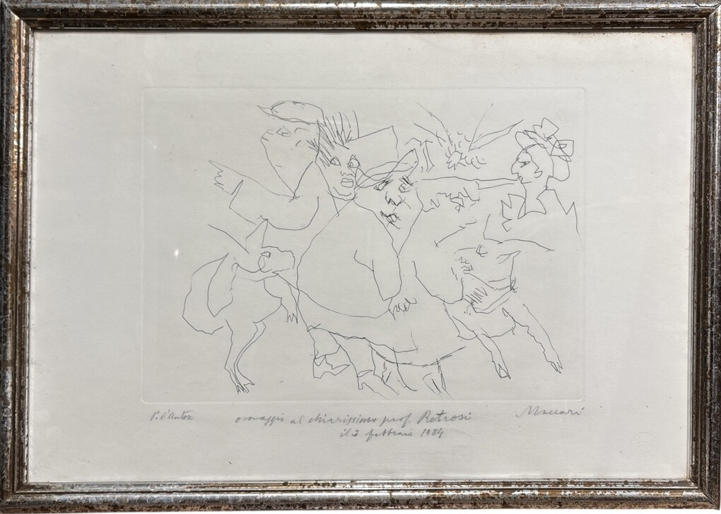 Mino Maccari, "Personaggi", es. P.d'A", 35 x 50 cm, 1984, dedica e firma a matita. In cornice.