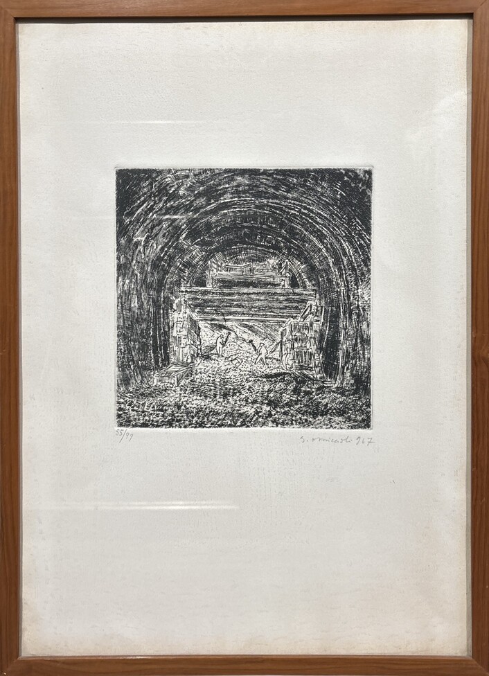 "Miniera", es. n. 55/99, 48 x 34 cm, firma a matita in basso a destra. In cornice. Giovanni Omiccioli (1901 - 1975)