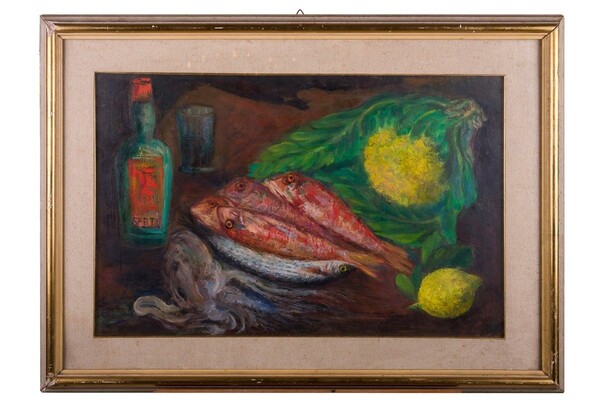 Entro cornice Natura morta con pesci e bottiglia XX secolo dipinto ad olio su...