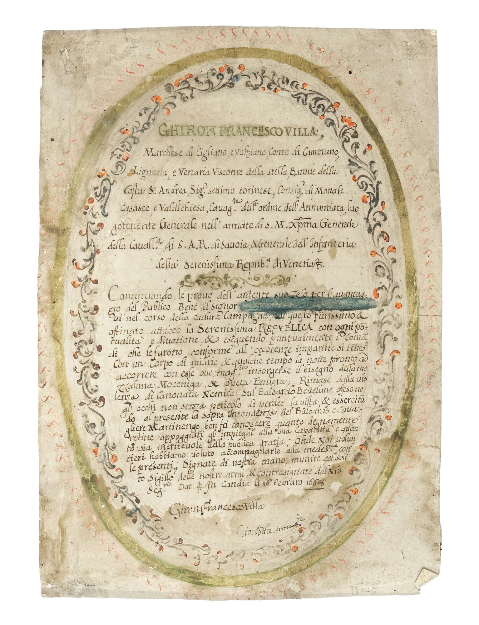 Manoscritto a inchiostro bruno. 1 carta scritta al recto. Documento rinforzato in tela. Testo in italiano all'interno di un ovale. Fregi e fiori al contorno. Qualche segno del tempo. Diploma conservato nella busta originale di un celebre libraio milanese. Dimensioni 350x250 mm. (1) Documento con intestazione Ghiron Francesco Villa, Generale dell'armate di S. M. [...], Generale della Cavalleria di S.A. R. di Savoia e Generale dell'Infanteria della Serenissima Repubblica di Venezia. Il testo continua: Continuando le prove dell'ardente suo zelo per l'avantaggio del pubblico bene il signor [nome cancellato da mano antica] nel corso della caduta Campagna [...] si tenne con un corpo di militie pronto ad accorrere [...]. Rimase dalla violenza di cannonata nemica sul Baluardo Bettelune offeso negl'occhi non senza pericolo di perdere la vista [...].