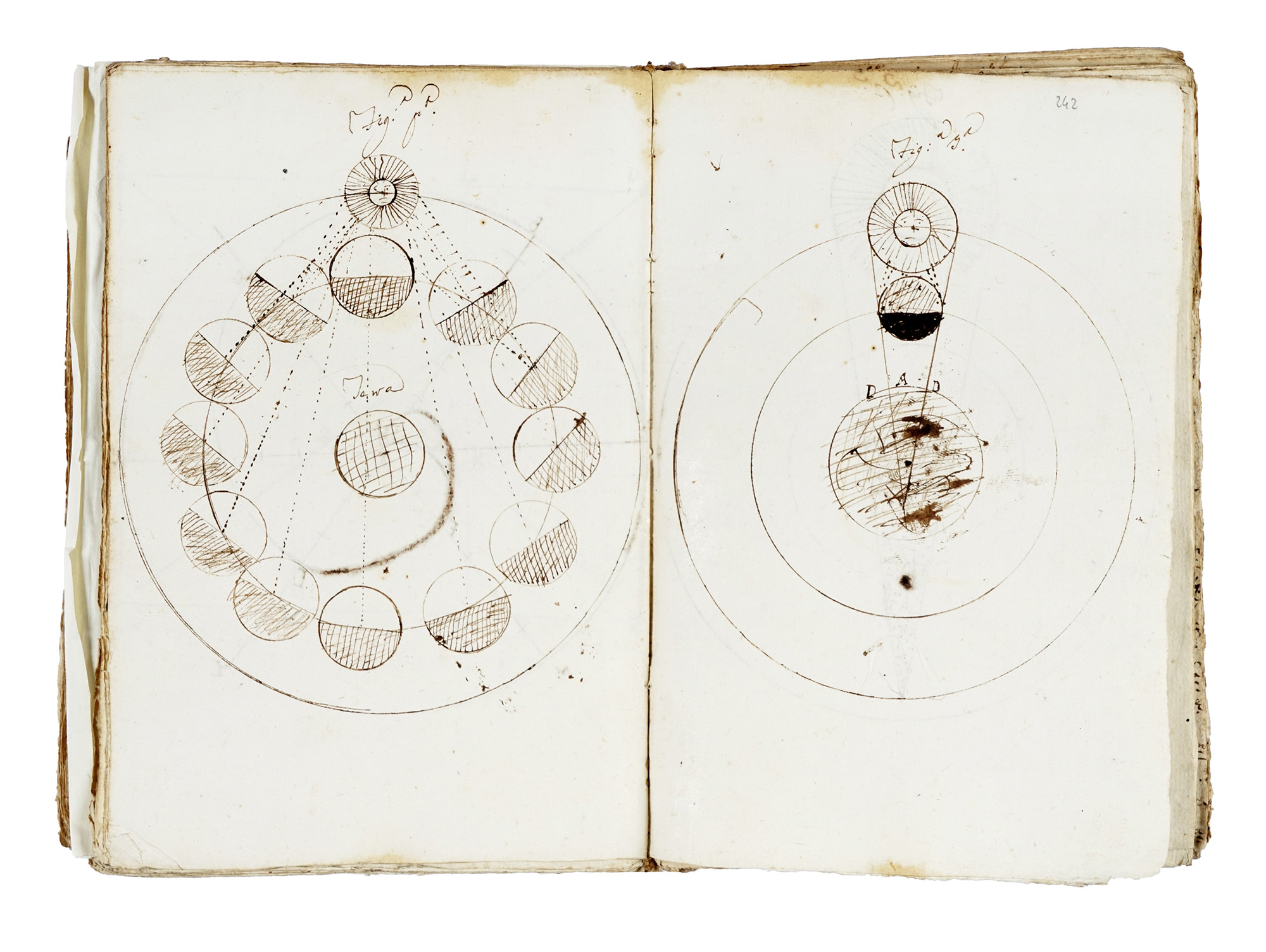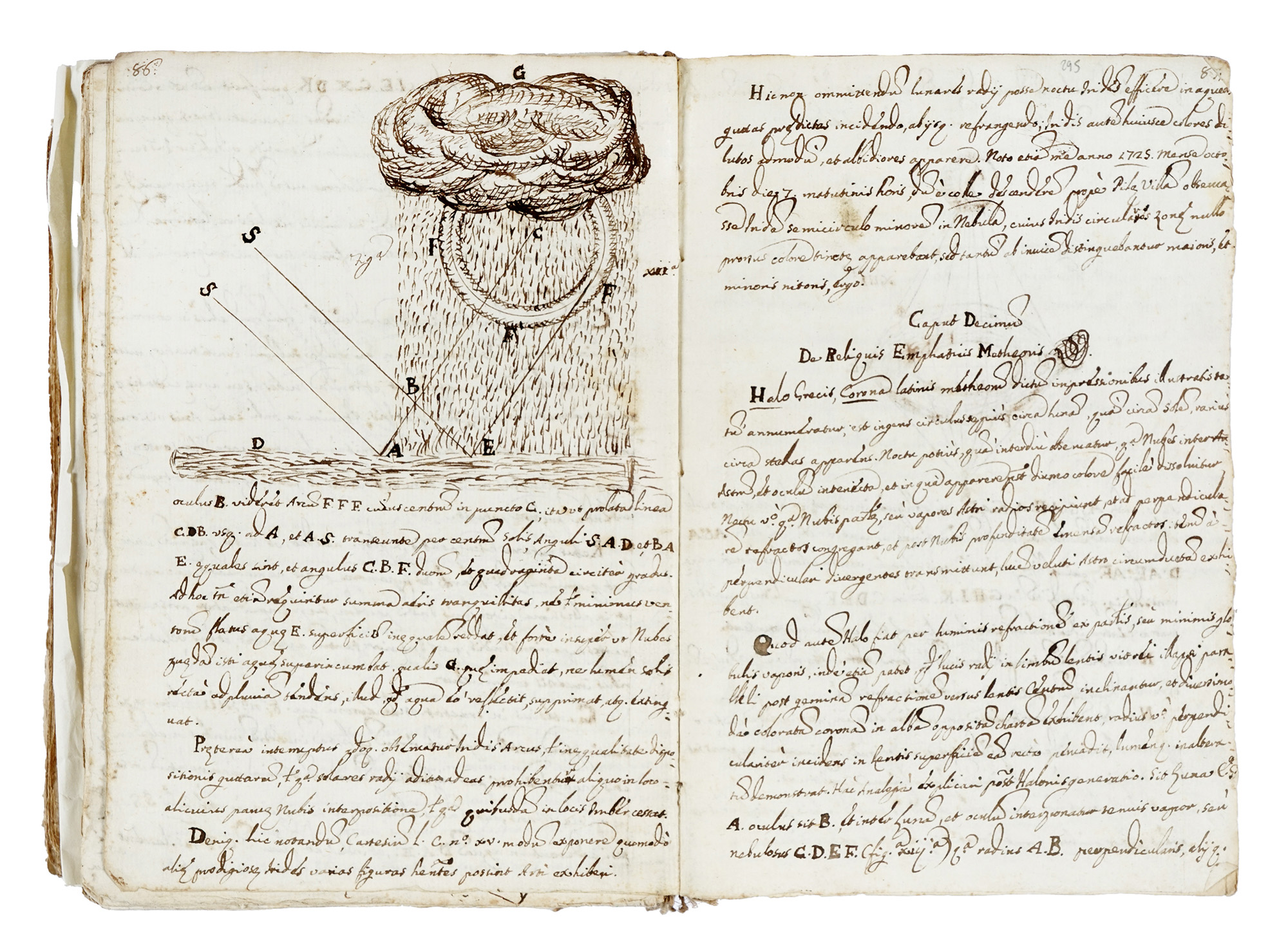 Manoscritto cartaceo a inchiostro bruno, in latino. Pagine 576. Numerosi disegni esplicativi a inchiostro. Una lieve usura all'angolo superiore destro non impedisce la fruizione del testo. Fascicoli cuciti tra loro, ma senza legatura. Databile prima metà XVIII secolo. Dimensioni 140 x 200 mm. (1) Il trattato è suddiviso in libelli, partes e capita. La prima parte è intitolata: De corpore naturali generatim consideratio; particolare è il Caput septimus De chimicormum elementis, dove il testo è intervallato da disegni di boccette e alambicchi. Segue il Codex primus, de parte tertia philosophiae: si parla di ignis, acqua et tellus degli atomi, delle teorie di Cartesio, di metafisica, dell'infinito, di Aristotele, del vuoto, della natura del moto ecc. Troviamo poi un Tractatus de mundo et caelo, dove si tratta di astronomia, del sistema tolemaico confrontato con quello copernicano, del sole, della luna, delle comete, delle stelle fisse, del globo terracqueo, della salsedine del mare, dell'origine di fonti e fiumi, del magnetismo, del fuoco sotterraneo e dei terremoti ecc. In fondo al Codex ci sono numerosi disegni: la rappresentazione tolemaica (geocentrica) del sistema solare, quella copernicana (eliocentrica), alcune costellazioni, fasi lunari ed eclissi ecc. Inizia poi la sezione intitolata: De Metheoris, che riguarda l'atmosfera, le nubi, la pioggia, la neve, la grandine, i tuoni, i lampi, i fulmini, i venti ecc. Molto interessante è il Caput nonus, De impressionibus emphaticis et primo de iride, dove vengono affrontati i fenomeni legati alla rifrazione della luce, compreso l'arcobaleno e l'alone solare; le spiegazioni tecniche sono accompagnate da alcuni disegni: la deviazione della luce nell'acqua in un calice, in un vaso di vetro, in un prisma e in una sfera e infine, artistiche raffigurazioni dell'arcobaleno sotto pioggia e nubi e dell'alone solare.