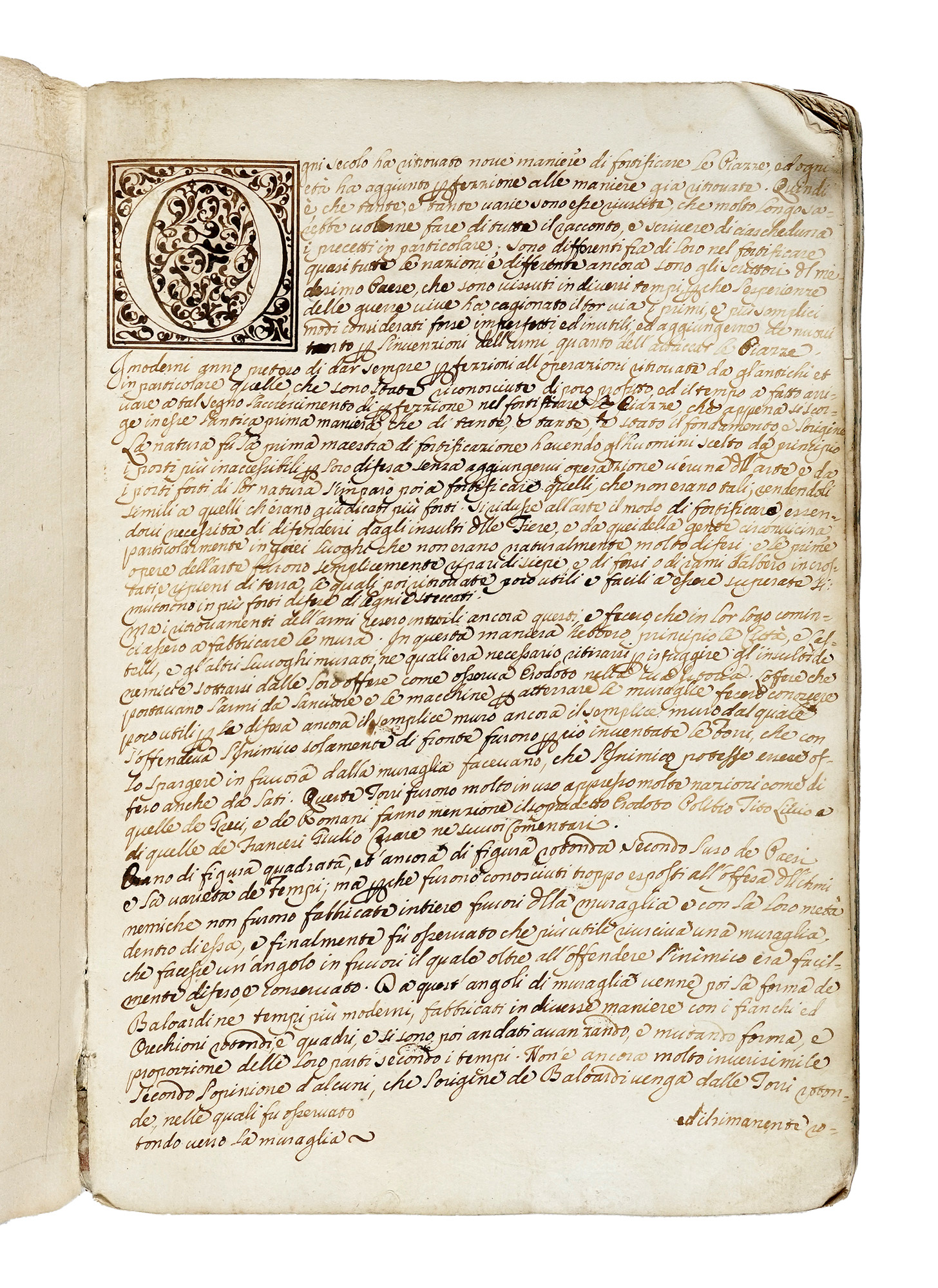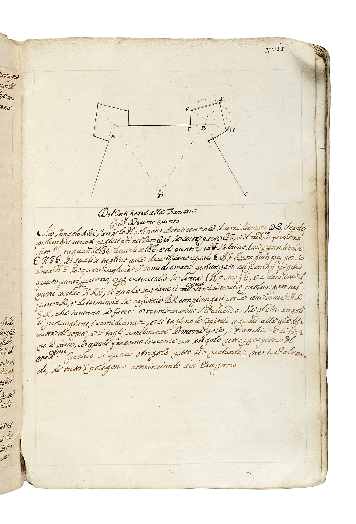 Manoscritto cartaceo a inchiostro bruno. Pagine [65] scritte (più 15 bianche). Numerosi disegni geometrici esplicativi a inchiostro fino alla pag. 35. Due capilettera ornati a inchiostro. Legatura cartonata coeva in carta marmorizzata (usurata dal tempo). Databile metà XVIII secolo. Dimensioni 240 x 360 mm. (1) Interessante manuale tecnico sull'argomento delle fortificazioni (sul quale anche Galileo Galilei scrisse due famosi trattati). Suddiviso in capitoli e con citazioni di noti esperti italiani e stranieri (il conte e ingegnere Blaise Pagan, Giuseppe Rossetti, Manesson Mailt [Mallet]), inizia, dopo il prologo, con la regola della fortificazione, che si divide in due parti: la prima per fortificare i Poligoni regolari, l'altra gl'irregolari. Numerosi e curiosi sono i nomi delle varie fortificazioni: faccia del baloardo, contrascarpa, all'italiana, alla francese, all'olandese; rivellini; mezze lune; tanaglie semplici e doppie; opere coronate; cavalieri; fortini a stella ecc. Incipit: Ogni secolo ha ritrovato n[u]ove maniere di fortificare le Piazze ed ogni età ha aggiunto perfezzione alle maniere già ritrovate [...]. Explicit: Del Profilo Capitolo VI [...] l'altezze e le grossezze delle pareti de' ripari e le larghezze e profondità de' fossi e tutto quello chè sollevato sopra il piano della campagna.