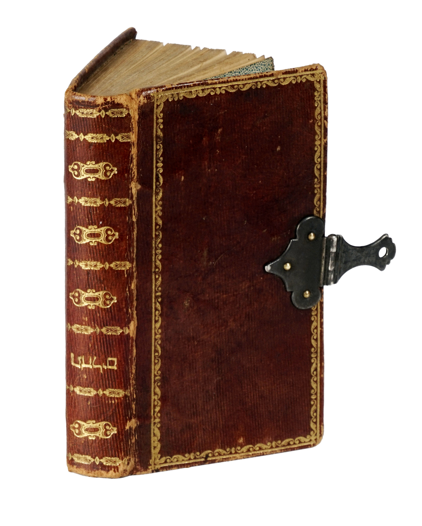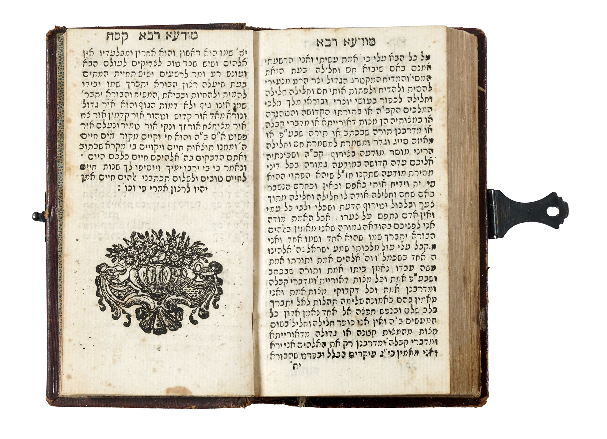 Volume a stampa tipografica completo, misurante mm 120x65 ca., per 172 carte complessive [3+166+3], con specchio di scrittura di mm. 110x55, testo ebraico quadratico all'inchiostro nero (vocalizzato al testo dei Salmi e non vocalizzato al testo di preci e sermoni diversi) distribuito su 18 righi di testo a facciata, contenente una selezione di Salmi per la recita quotidiana, ripartita per le devozioni dei singoli giorni della settimana e in occasione di particolari festività ebraiche quali il Giorno dell'Espiazione (Yom Kippur), nonché una serie di commenti, esortazioni e preci aggiuntive stampate nella scrittura rashi "del commento", che si estende fino a un massimo di 30 righi a facciata. Decorazioni riproducenti modelli a strenna e ceste fiorite di gusto neoclassico tardo-settecentesco stampate in bianconero al termine di ogni sezione; termini notevoli all'interno della pagina di testo a modulo maggiore, in grassetto. Conservato in condizioni eccellenti: minimi segni del tempo. Raffinata legatura decorata con fermaglio centrale metallico a singolo punto di chiusura. (1) La città di Livorno fu sviluppata come porto tirrenico mediceo per volontà di Cosimo I de' Medici a partire dalla metà del Cinquecento: beneficiando di un'incoraggiante politica di immigrazione, nel tempo vi si stabilì una vivace comunità ebraica per lo più sefarditica iberica od orientale. Alla fine del XVIII secolo, la stamperia ebraica livornese di proprietà di Giovanni Vincenzio Falorni, si ritrovò ad essere la sola in attività in Italia, e lo stampatore Ya'aqov Nunes-Va'is (che morrà appena trentenne il 1815), collaboratore di Refa'el Meldola, rabbino di Livorno tra il 1803 e il 1805, intraprese l'attività di diffusione di materiale liturgico ebraico a specifico beneficio dei membri delle comunità giudaiche orientali di estrazione popolare. In questo senso, la menzione a benedicente memoria del rabbino di Hebron Chaim Avraham Isra'el ben Binyamin Ze'evi (morto il 1731) risalta come assai significativa.