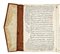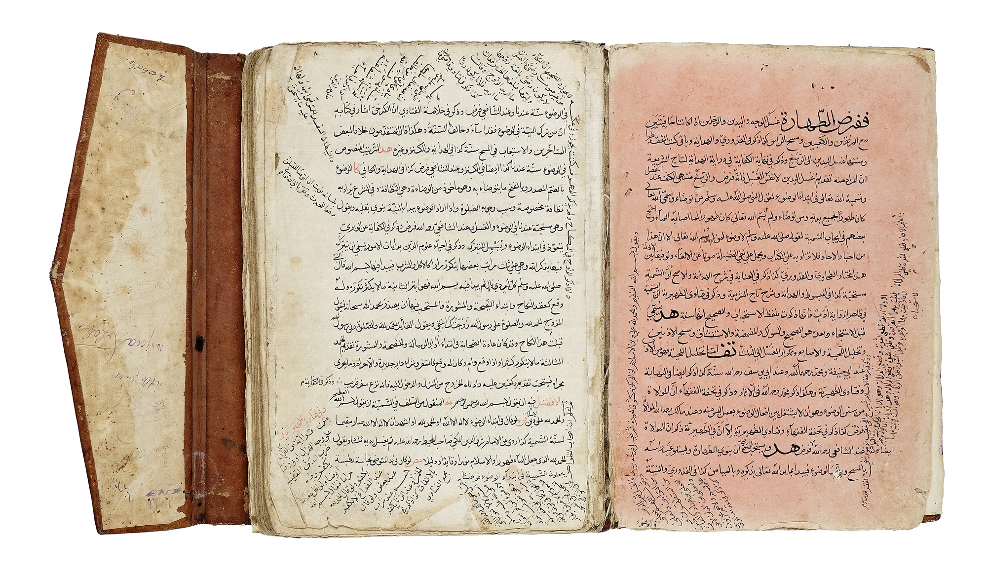 Manoscritto arabo su carta vergellata orientale, sguardie posteriori in carta europea d'importazione (filigranate con tre mezzelune crescenti), formato di 154 carte complessive [2+150+2], dal foglio di dimensioni 260x175 con spazio scritto misurante mm 195x120; testo arabo distribuito su singola colonna di 19 righi a facciata vergato in grafia naskh orientale all'inchiostro nero e titoli rubricati in inchiostro rosso chiaro per sezioni tematiche e termini notevoli. Alcune formule di passaggio e termini enfatizzati, rubricati o meno, sono talora vergati in uno stile thuluth a modulo lievemente maggiore di quello del naskh testuale. Alla carta iniziale del manoscritto leggiamo il titolo Kitab al-Jawahir Mawa'iz ("Perle dei Sermoni Edificanti"), laddove al colophon l'autentico titolo dell'opera è riportato per esteso come già menzionato, insieme con il nome dell'autore, anch'esso in formula estesa. Il testo dell'opera si apre con la rituale basmala islamica di intestazione a 3v.; timbro di possesso a 4r.; presenza regolare di reclamantes al margine inferiore sinistro di ciascuna carta. Numerose ed estese annotazioni ai margini. Carta 7 appare colorata in rosso chiaro. Condizioni generalmente buone, a eccezione di diffusi deterioramenti della carta ai margini inferiori, soprattutto in apertura; diffuse macchioline, gore di umidità, specialmente ai margini superiori e attorno la linea interna di cucitura; ingiallimento della carta e qualche lacerazione, senza pregiudizio di leggibilità tranne che alle cc. 1, 113 e 114. Bella legatura islamica su cartone ricoperto in pelle marroncina, dotata di ribalta, con piatti esterni simmetrici impreziositi da decori perimetrali concentrici ad arabesco impressi e struttura assiale centrato su medaglione a mandorla, purtroppo affetta da ampia macchia d'inchiostro all'area inferiore sinistra del piatto anteriore. (1) Il Jawahir al-Fiqh è un'opera di diritto di scuola hanafita strutturata in 10 sezioni (abwab) a loro volta suddivisi in capitoletti (fusul), che l'Autore, in questa sua unica opera, dichiara di aver voluto comporre nel segno della brevità e della tradizione dei pareri legali islamici affinché i musulmani devoti, soprattutto quando si trovino in viaggio in luoghi a maggioranza non musulmana possano avvalersi di un agile strumento di consultazione pratica riguardo alle questioni rituali ortopratiche e le norme di comportamento che si esigono dal fedele, con particolare riguardo all'etichetta islamica del viaggiatore. Altra finalità dichiarata è quella di espandere e corroborare la scuola di diritto cui l'Autore appartenne, quella hanafita. Alle prime carte l'Autore cita molte sue fonti, dalle quali si evince una spiccata predilezione per l'approccio della scuola orientale Maturidi. Tahir al-Khwarazmi fu infatti un imam e studioso sunnita di diritto hanafita vissuto nella prima metà del XIV secolo (morì dopo il 1369/'70, o AH 771), allievo della scuola hanafita bukharese di Shamsu'd-Din al-Kurlani. Si vedano i contributi di: Abylov, Abdilkhakim & Kurt in: EJRS 2022 (32) ed Elmedeni, E. (2020), in: Uluslararası Sosyal Araştırmalar Dergisi / The Journal of International Social, Vol. 13, Issue 74, in arabo). Una copia di quest'opera appartiene alla Daiber Collection dell'Università di Tokyo (ms. 18) e una seconda, non datata e verosimilmente seriore, trova posto nella Yahuda Collection (NE-1505, ms. no 770) presso la Jerusalem National University Library (JNUL).