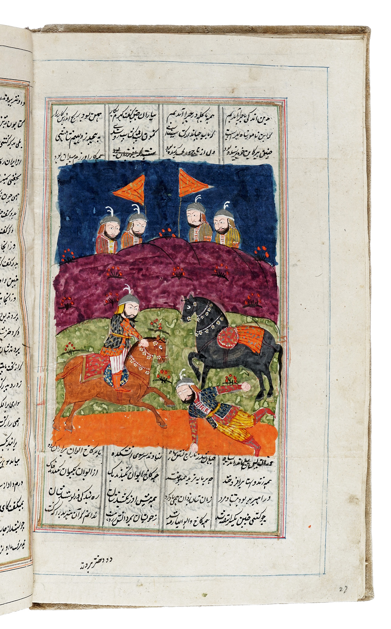 87 carte complessive [1+85+1] per 169 facciate totali (da 1v. a 85v.). Misure medie del foglio: mm. 330 x 200 ca.; misure dello specchio di scrittura: mm. 265 x 140 ca.; testo poetico persiano in metro mathnavi (distici rimati, su schemi ritmici vari) distribuito su 25 righi per 4 colonne a facciata, vergato in calligrafia nasta'liq all'inchiostro nero e titolature rubricate, nel pieno rispetto dei canoni formali compositivi dei poemi epici persiani dall'età safavide in poi. Il sistema decorativo di questo manoscritto consiste in una pregevolissima decorazione sarlawh iniziale a cupola formata da elementi a cuspide ai colori tipicamente nord-indiani di blu-azzurro, oro e rosso tenue, occupante la metà superiore della carta 1v. di apertura, nonché 7 miniature di soggetto marziale, tutte misuranti tre-quarti di pagina e poste al suo centro, ubicate alle carte: 4v. (Scena di duello a cavallo); 9v. (Eskander/Alessandro piange sul cadavere di Dara/Dario); 15v. (Bahram uccide il drago); 20r. (Rostam abbatte un turaniano in duello); 27v. (Ancora in duello, Rostam disarciona un nemico); 51r. (Rostam, morendo, trafigge a morte Shaghad) e infine a 72r. (Uccisione di Esfandiyar). Numeri di pagina segnati a matita al margine inferiore destro del verso di ogni carta, secondo una foliazione non sempre coerente. Legatura ottocentesca seriore dai piatti di cartone e foderati di velluto color sandalo, inornata. Le condizioni generali di questo manoscritto sono discrete. (1) Manoscritto persiano su carta vergellata e polita, contenente un'antologia di passaggi tratti dallo Shahnameh, il celeberrimo "Libro dei Re", di Abo'l-Qasem Ferdowsi. La materia di questo codice è definita al colophon "terzo daftar" termine traducibile come "libro" e concepito, nella presente veste manoscritta, come il terzo volume di un'opera in quattro parti – dal momento che tale porzione del poema corrisponde al quinto libro, su otto totali, dell'edizione di riferimento moderna Khaleghi-Motlaq. Si tratta, insomma, del terzo tomo di una sorta di "edizione" manoscritta multivolume realizzata in Kashmir. Lo Shahnameh ("Libro dei Re") di Abo'l-Qasem Ferdowsi costituisce di gran lunga il più celebre poema epico dell'intera tradizione persofona, la quale, come è noto, non restò mai confinata all'altopiano iranico, ma coinvolse gran parte dell'Asia Centrale e la parte centro-nordoccidentale del Subcontinente indiano. Tale opera monumentale costituì per secoli, nel quadro di un vasto canone poetico-letterario, un importante riferimento culturale per le élite locali, plasmandone profondamente l'etica personale e le virtù del "javanmardi" guerresco.