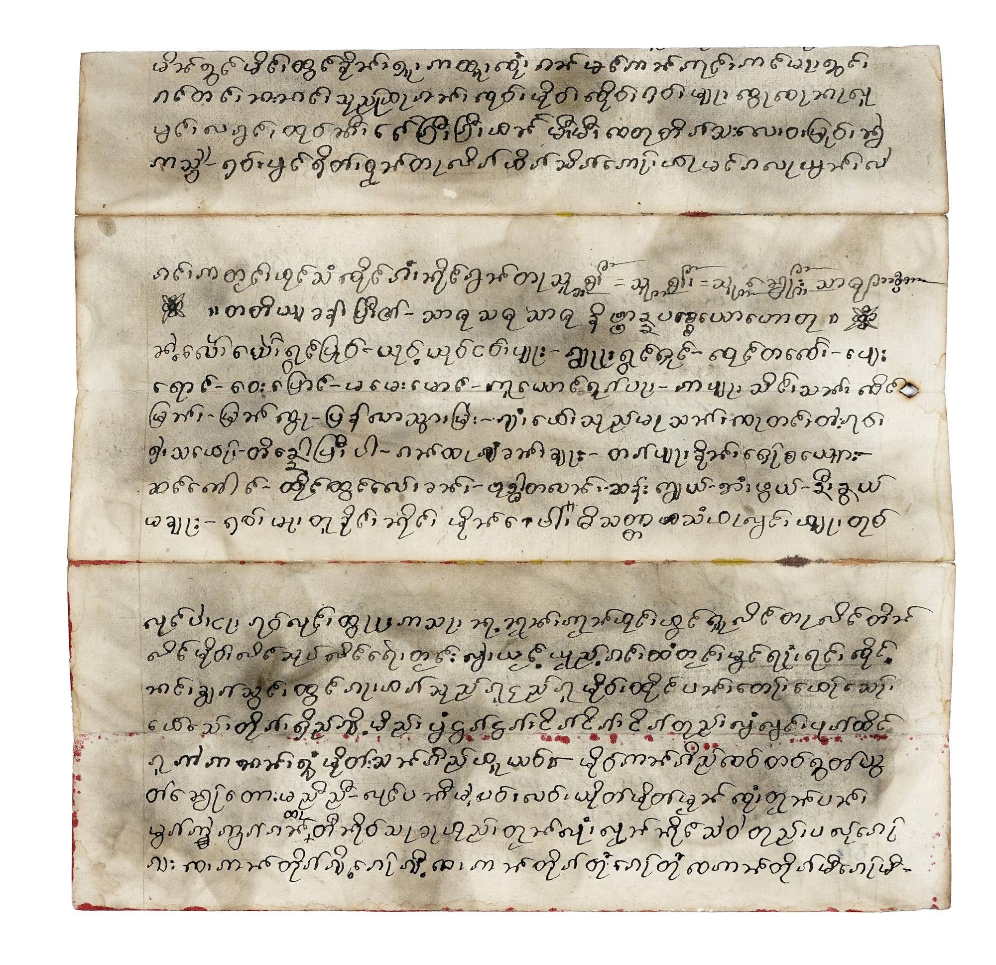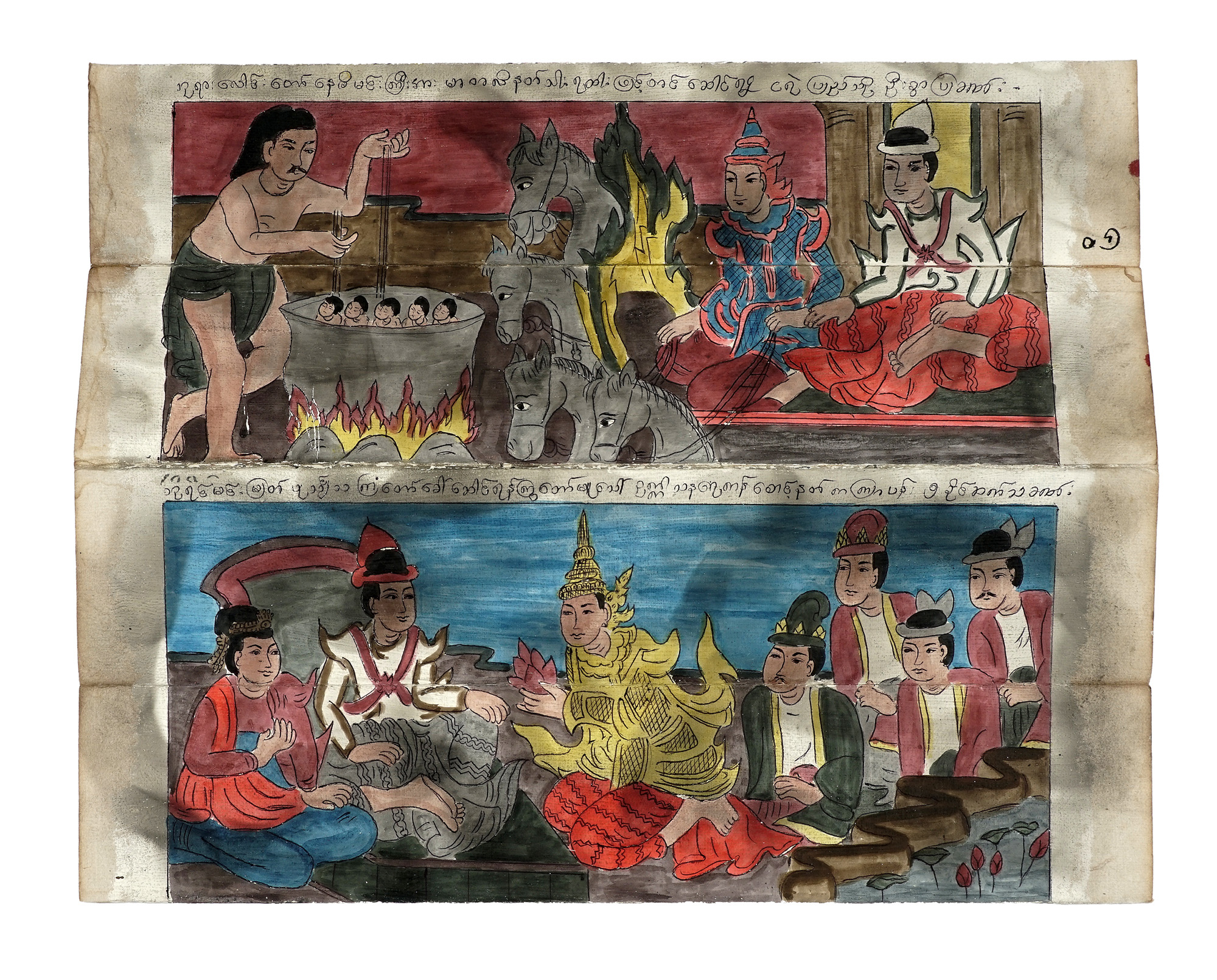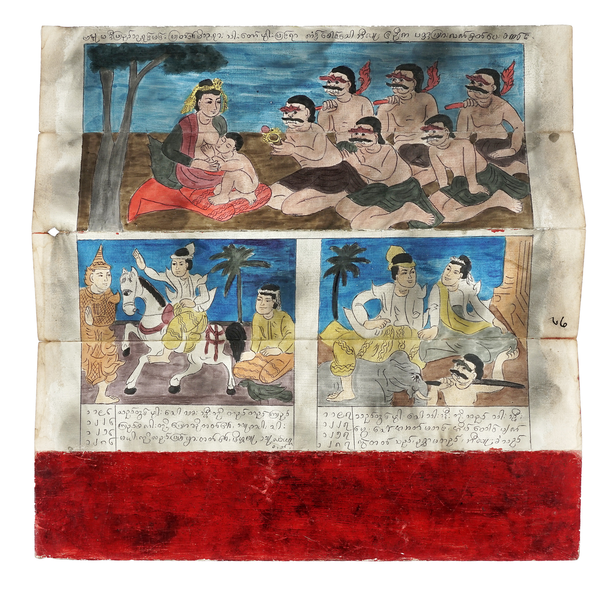 Manoscritto birmano di formato oblungo originariamente a leporello, le cui pagine si sono distaccate restando unite a sezioni formate, rispettivamente, da tre fogli doppi, un foglio quadruplo e uno quintuplo, misuranti complessivamente mm 1320x430 (al singolo foglio: 85x430) con specchio di scrittura irregolare; testo in lingua e scrittura birmana classica distribuito su 4 righi a piega di pagina (60 righi complessivi al recto, distribuiti per 4 righi a facciata) all'inchiostro nero, corredato di 8 miniature a colori vividi occupanti lo spazio di due facciate accompagnate da didascalie di una riga, ad eccezione di due miniature che ricoprono una facciata ciascuna, con sottostante didascalia di tre righi. Copertina di cartoncino laccato rosso inornata, in buono stato. (1) Sia il testo che le miniature, comprendenti scene di venerazione e rappresentazioni di personaggi della corte regale, entità e creature magiche (il drago, il cervo d'oro, lo spirito nat, demoni e creature acquatiche dette naga), illustrano vicende mitistoriche che alludono all'introduzione del Buddhismo in Birmania nella variante Theravada. A titolo esemplificativo, una scena "Il grande re dei nat, il grande e glorioso Sangha (comunità monastica), arrivò a Tha Ton (antica capitale birmana)". Non mancano ulteriori esempi della centralità delle figure religiose buddhiste semimitiche, quali Sona Thera che lascia Thaton (città Mon nel sud della Birmania) per andare a Prome (oggi Pyay), centro di rilievo dell'antico regno Pyu.