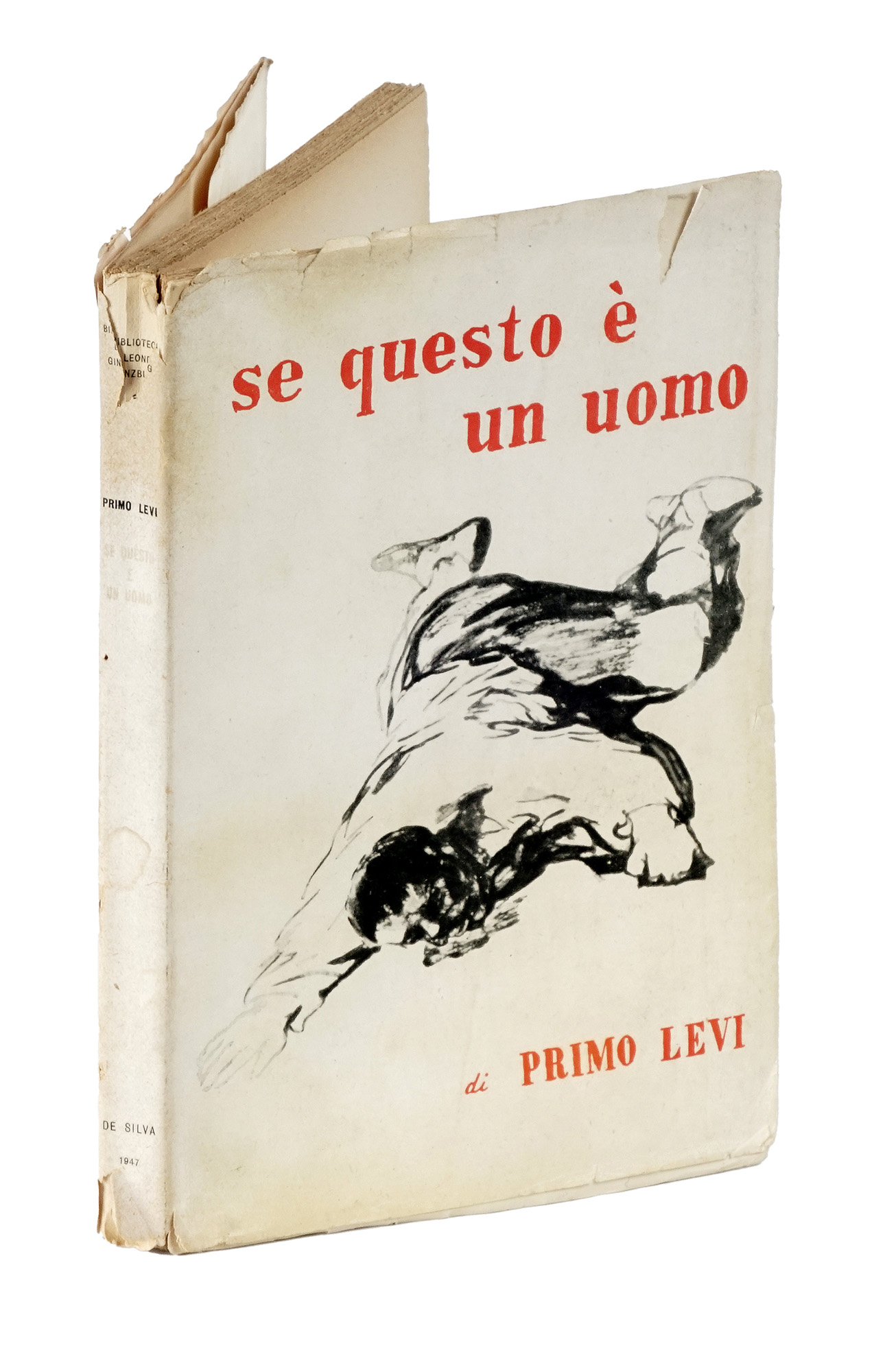 In-8° (mm 195x126). Pagine 197, [3]. Tre piccoli strappi marginali senza perdite, altrimenti ottimo esemplare in barbe. Brossura editoriale con titoli in rosso e nero al piatto e al dorso. Un piccolo difetto alla cerniera anteriore. Presente la rarissima sovraccoperta originale illustrata, con lievi aloni marginali, strappetti ai piatti, una mancanza alla cuffia superiore con perdite di inciso e l'aletta posteriore parzialmente staccata. (1) Prima edizione di uno dei capolavori della letteratura del Novecento e opera prima di Levi, «nata fin dai giorni di lager per il bisogno irrinunciabile di raccontare agli altri, di fare gli altri partecipi». Il libro, stampato in 2500 copie, venne pubblicato per interessamento di Franco Antonicelli, anima delle edizioni De Silva. L'opera, che inizialmente non suscitò l'interesse del pubblico e della critica, ebbe invece grande eco internazionale con l'edizione Einaudi del 1958, quando iniziò ad essere riconosciuta come una delle massime testimonianze letterarie su Auschwitz. Edizione ormai rara, soprattutto quando provvista della sovraccoperta, perché De Silva, pochi decenni dopo, cedette il magazzino alla fiorentina Nuova Italia, che venne colpito dall'alluvione del 1966. Gambetti-Vezzosi, 446.