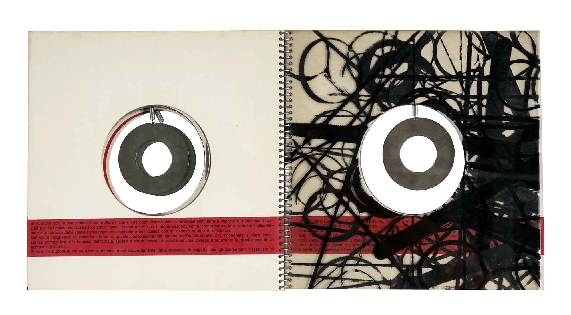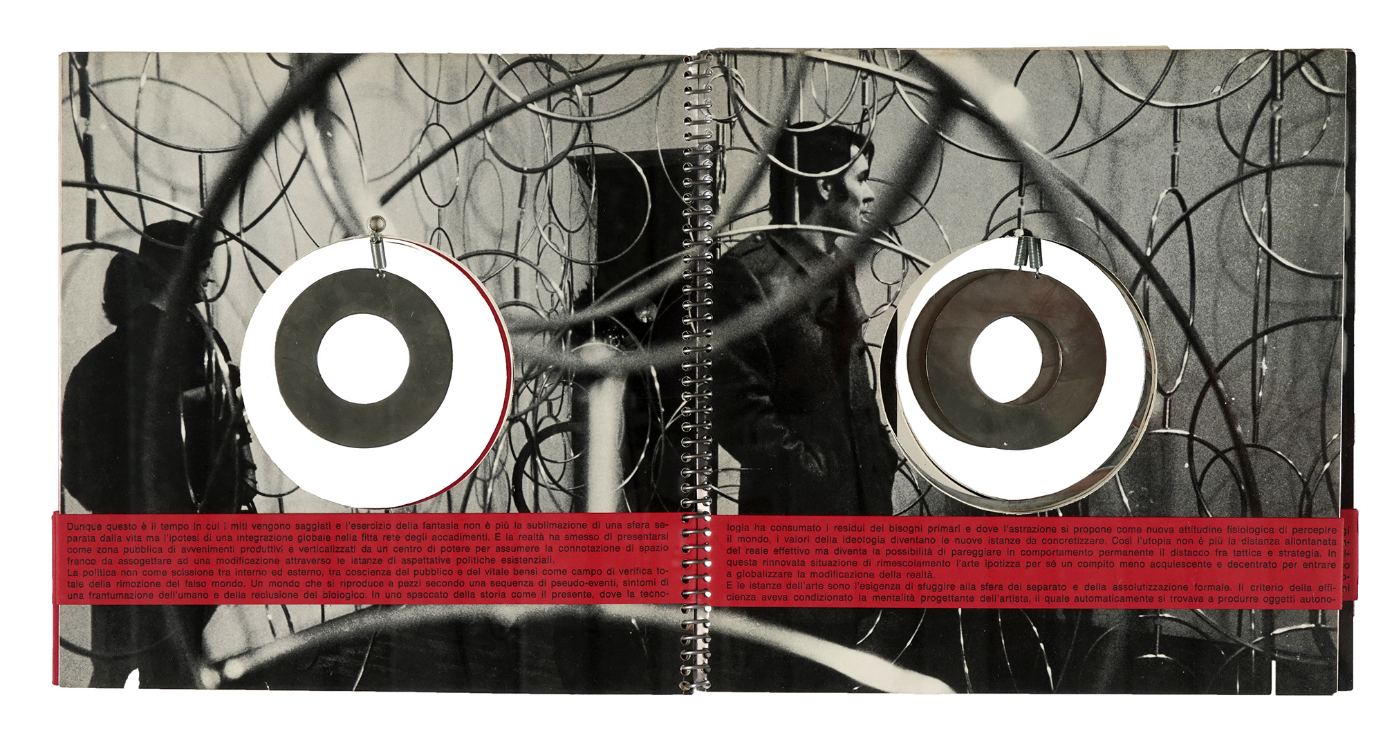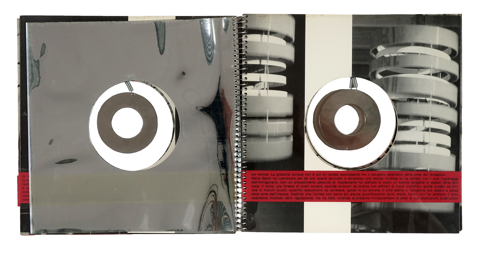 In-8° quadrotto (mm 212x212). Carte bianche, nere, trasparenti, a specchio, ripiegate e forate al centro, con tre anelli metallici inseriti al centro. Fascetta editoriale rossa, che percorre tutto il volume, con una presentazione di Achille Bonito Oliva. Brossura bianca in carta plastificata e spirale, anch'essa con foto centrale ai piatti. Tracce di foxing marginali, concentrate principalmente alla brossura, la quale presenta inoltre un piccolo strappetto al piatto posteriore, ma complessivamente buona copia. Tiratura in 500 esemplari non numerati. (1) Raro libro-oggetto che rappresenta una delle testimonianze più emblematiche dell'intersezione tra arte concettuale, musica e design editoriale. Pubblicato dalle storiche Edizioni Apollinaire di Milano e progettato dal celebre designer A. G. Fronzoni, I giochi del malessere si configura come un'esperienza sensoriale totale. L'opera è rilegata con grandi anelli metallici pendenti che, muovendosi al passaggio delle pagine, generano suoni tintinnanti: una precisa evocazione della componente sonora del lavoro, in linea con la poetica multisensoriale dell'autore. Le azioni e i "giochi" riprodotti nel libro furono eseguiti da Mario Nanni tra il 1967 e il 1968, e presentati in importanti spazi dell'avanguardia italiana come la Galleria Apollinaire di Milano, La Nuova Loggia di Bologna e persino alla Rinascente di Milano, dove l'artista realizzò un ambiente sonoro-visivo-tattile.