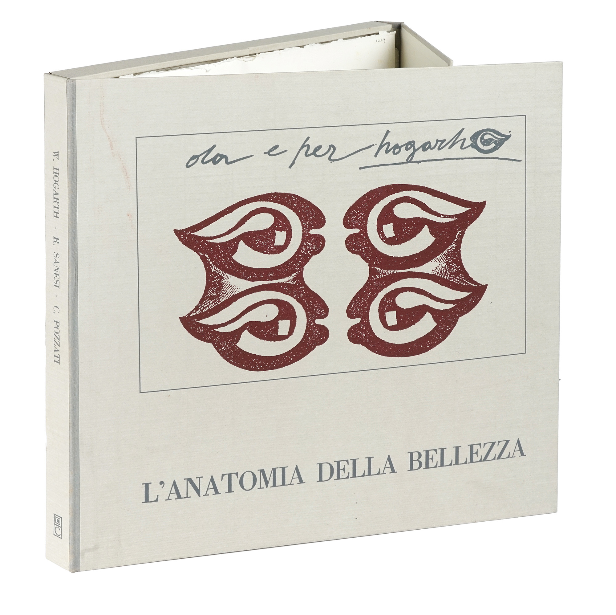 In-folio (mm 420x435). Esemplare in barbe, a bifogli sciolti, con 12 acqueforti di Concetto Pozzati incise in vari colori: 1 al frontespizio (mm 110x160), 10 a piena pagina nel testo (mm 365x385. Foglio: mm 410x430) e 1 a piena pagina fuori testo (mm 365x385. Foglio: mm 410x430). Tutte, tranne quella al frontespizio, numerate in basso a sinistra e firmate a matita dall'Artista in basso a destra. Rare fioriture. Il tutto conservato entro cartella editoriale in mezza tela, con illustrazione e titoli al piatto anteriore. Minime tracce d'uso. Uno dei 130 esemplari in numeri arabi, su una tiratura complessiva di 155 copie. (1) Bella opera sperimentale, con i testi inediti di William Hogarth, che segue il tipico stile anni '70 di decostruzione critica del linguaggio, qui con un felice equilibrio fra scrittura e immagine.