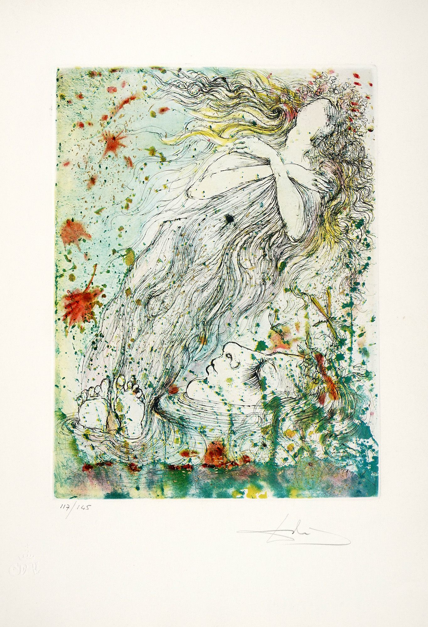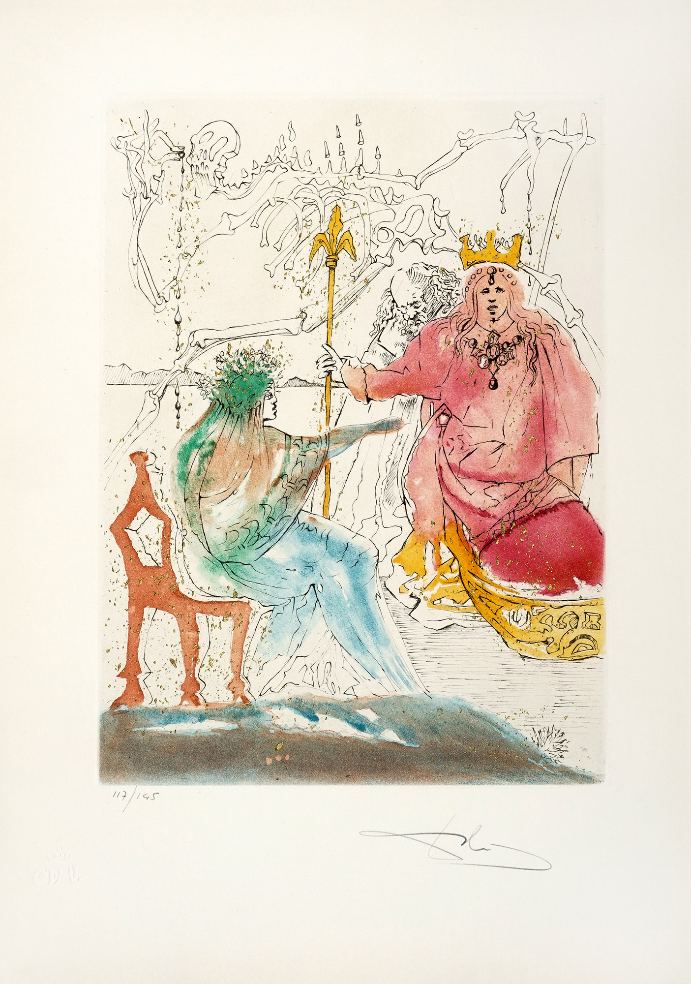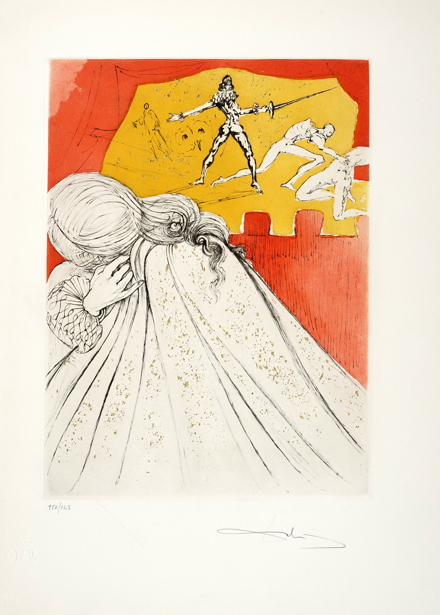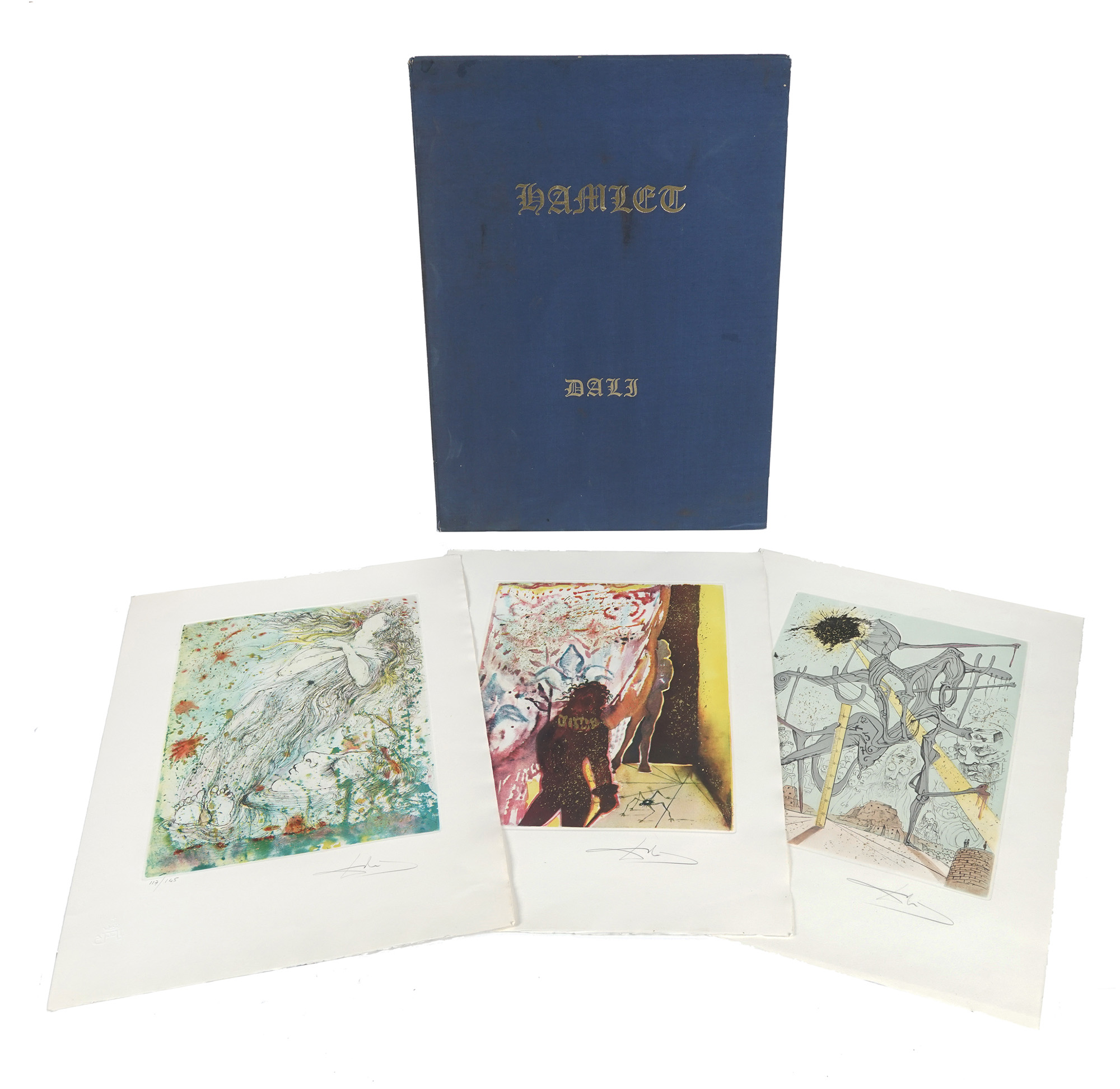 Cartella di 7 (su 10) splendide acqueforti a colori, con interventi in oro, di Salvator Dalì (mm 385x285 ca. Folio: 565x405), numerate in basso a sinistra e firmate a matita in basso a destra. Timbro a secco in basso a sinistra. Tre incisioni mancanti. Pieghe e rari strappetti marginali alle veline; qualche rarissimo e lieve alone marginale alle tavole, ma nel complesso ottimo stato di conservazione. Entro cartella editoriale in tela blu, con titoli in oro al piatto anteriore. Sbucciature e macchie ai piatti; difetti alle cerniere. Tiratura in 145 esemplari numerati. (1) Ispirato alla tragedia di Shakespeare, questo portfolio esplora temi esistenziali - tradimento, follia, morte - attraverso la visione surrealista di Dalí. Le composizioni combinano grafismi onirici, riflessi oro ed evocazioni teatrali, offrendo un'immersione poetica nella psiche di Amleto. Rarefatto e monumentale nella memoria visiva, il portfolio si inserisce tra i lavori grafici più raffinati di Dalí, dimostrando la sua maestria nelle tecniche incisorie e nell'utilizzo del colore come elemento narrativo.