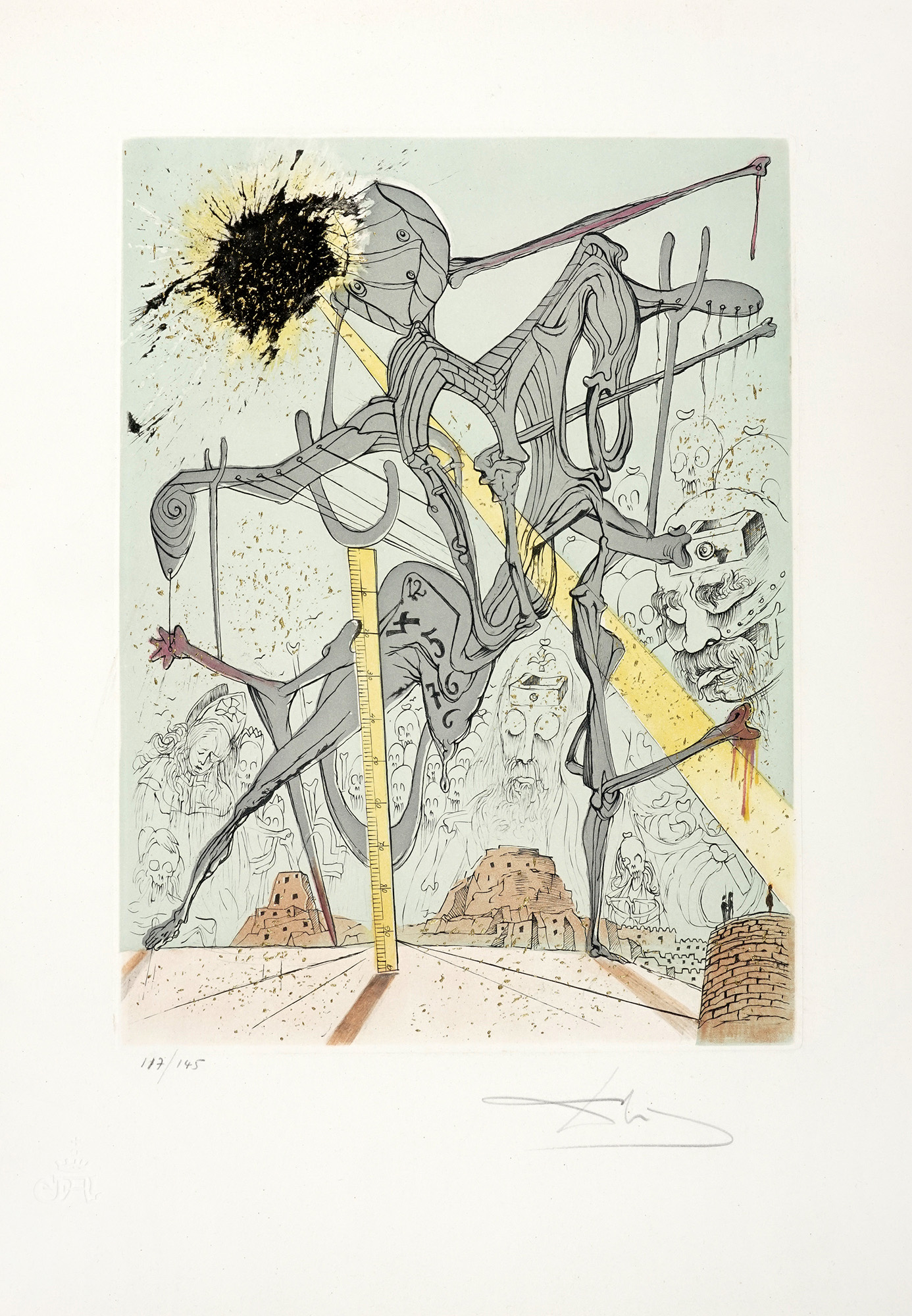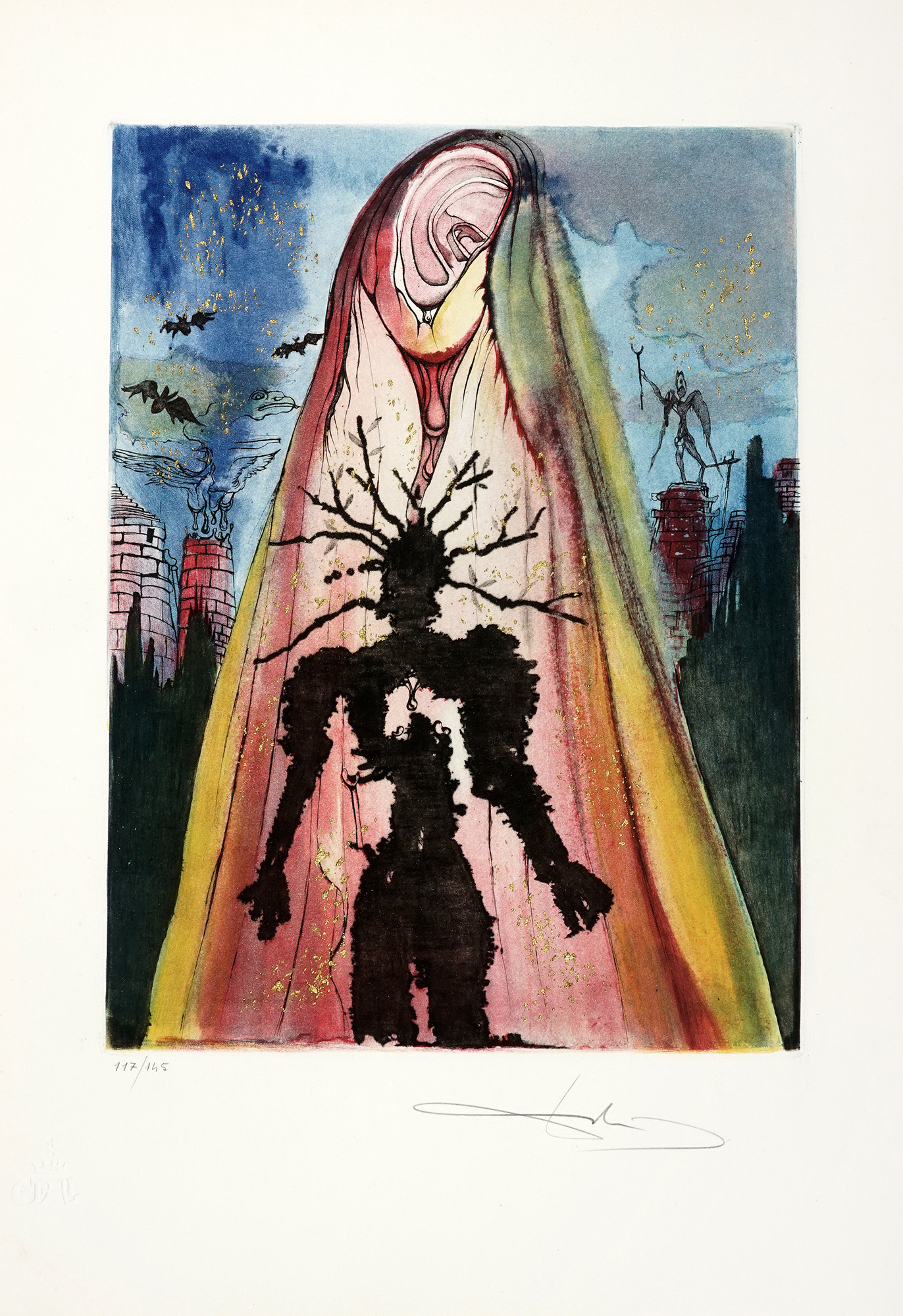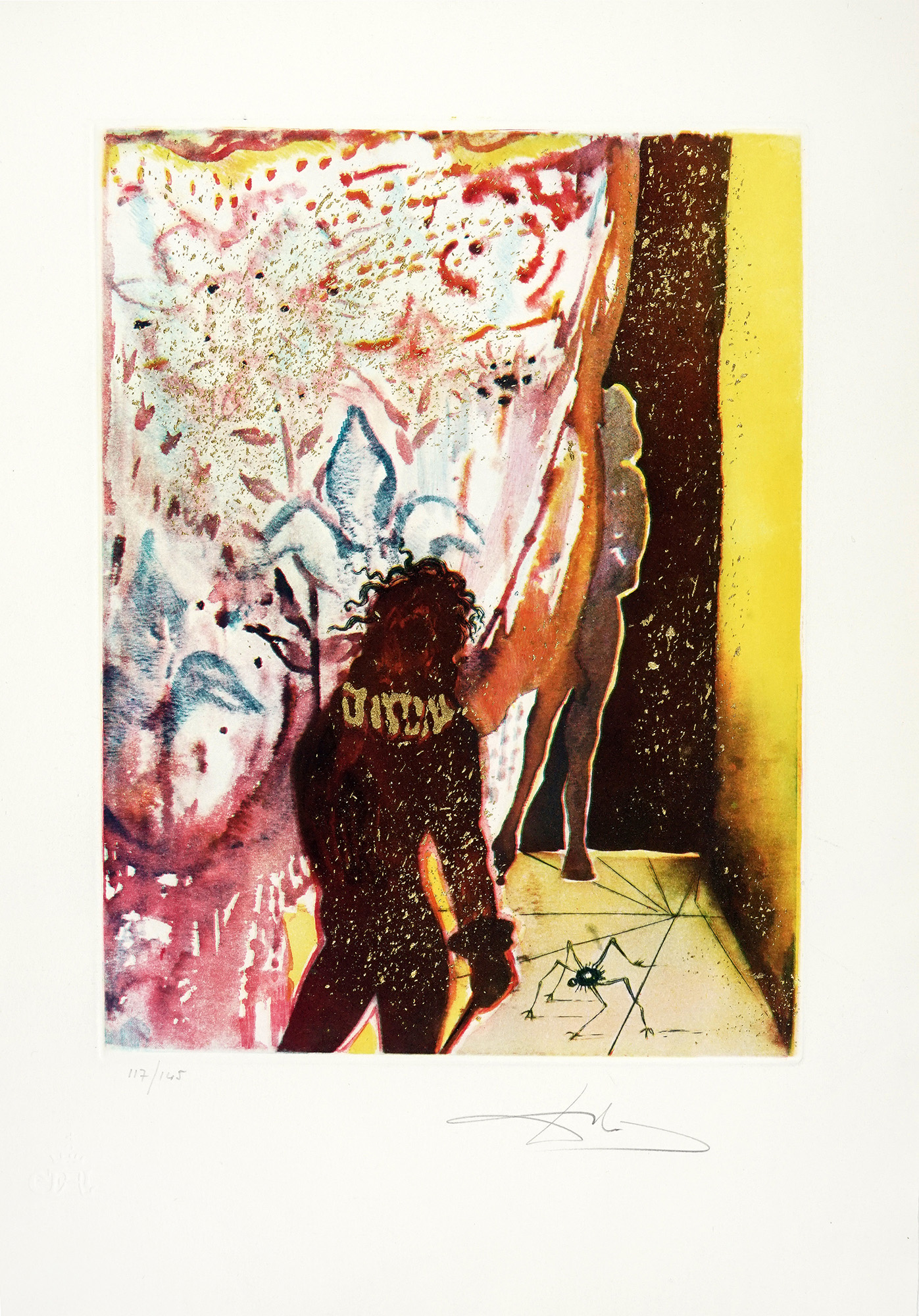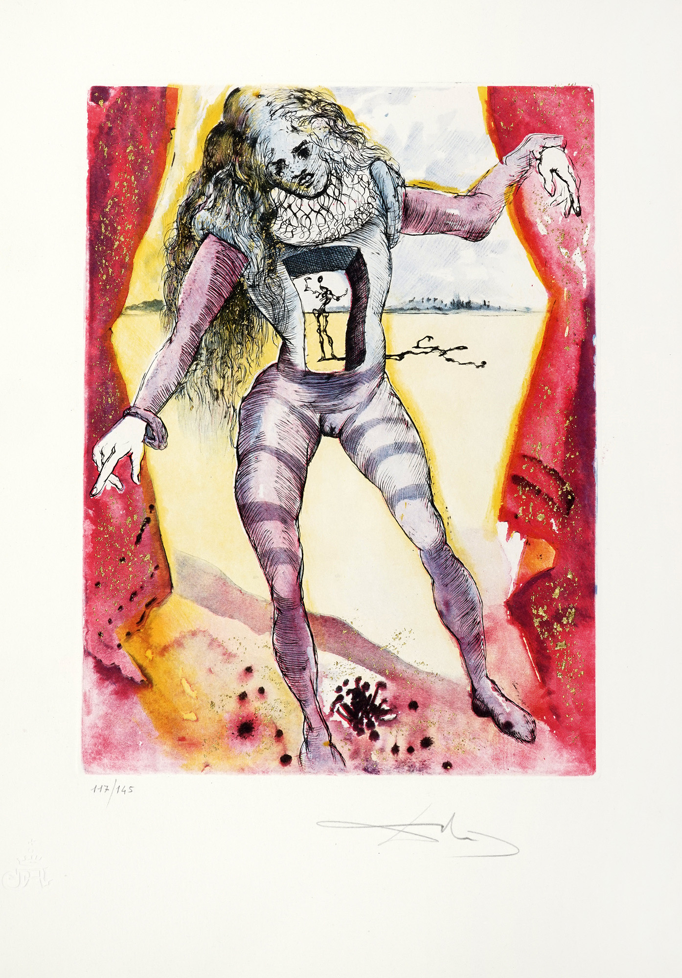 Cartella di 7 (su 10) splendide acqueforti a colori, con interventi in oro, di Salvator Dalì (mm 385x285 ca. Folio: 565x405), numerate in basso a sinistra e firmate a matita in basso a destra. Timbro a secco in basso a sinistra. Tre incisioni mancanti. Pieghe e rari strappetti marginali alle veline; qualche rarissimo e lieve alone marginale alle tavole, ma nel complesso ottimo stato di conservazione. Entro cartella editoriale in tela blu, con titoli in oro al piatto anteriore. Sbucciature e macchie ai piatti; difetti alle cerniere. Tiratura in 145 esemplari numerati. (1) Ispirato alla tragedia di Shakespeare, questo portfolio esplora temi esistenziali - tradimento, follia, morte - attraverso la visione surrealista di Dalí. Le composizioni combinano grafismi onirici, riflessi oro ed evocazioni teatrali, offrendo un'immersione poetica nella psiche di Amleto. Rarefatto e monumentale nella memoria visiva, il portfolio si inserisce tra i lavori grafici più raffinati di Dalí, dimostrando la sua maestria nelle tecniche incisorie e nell'utilizzo del colore come elemento narrativo.