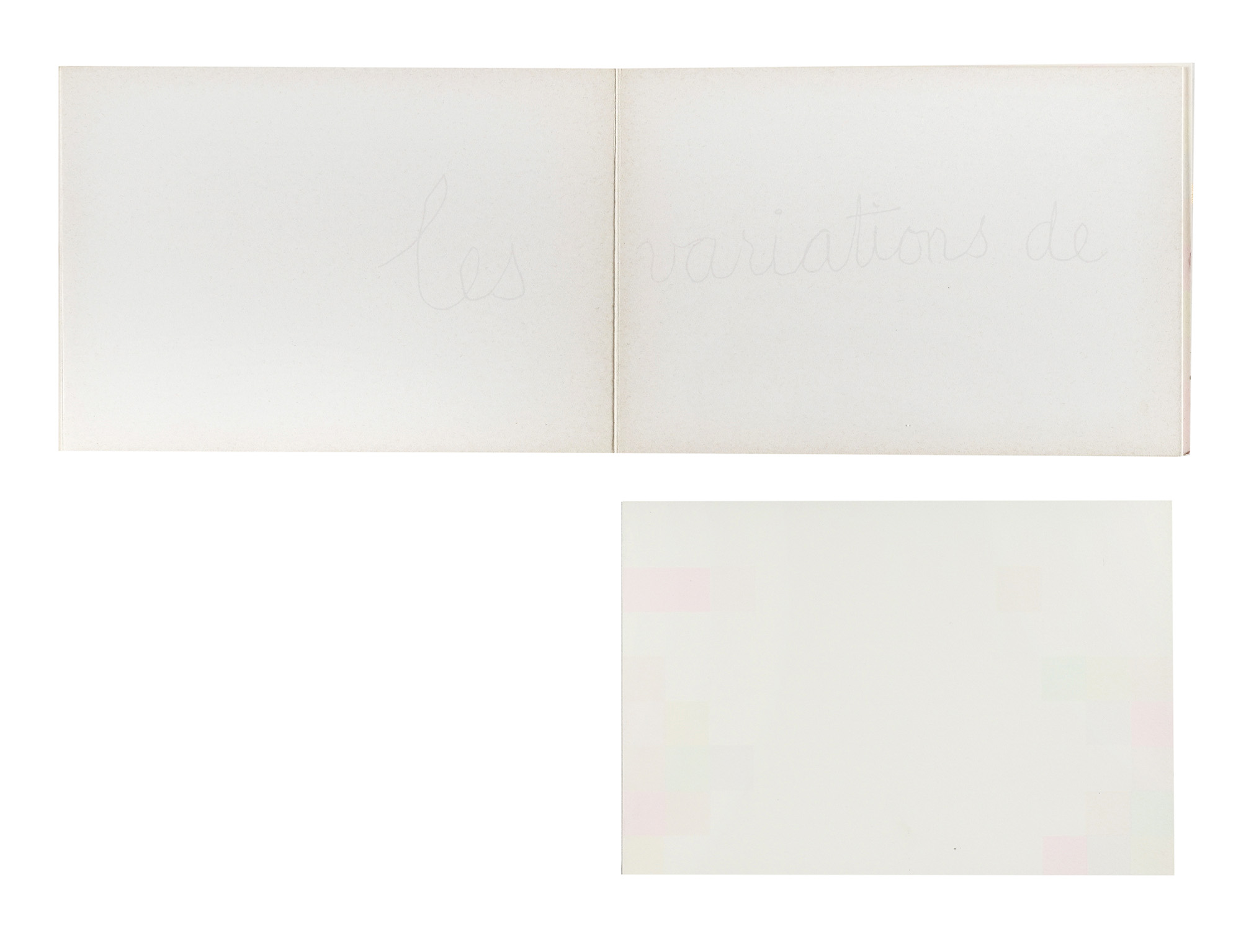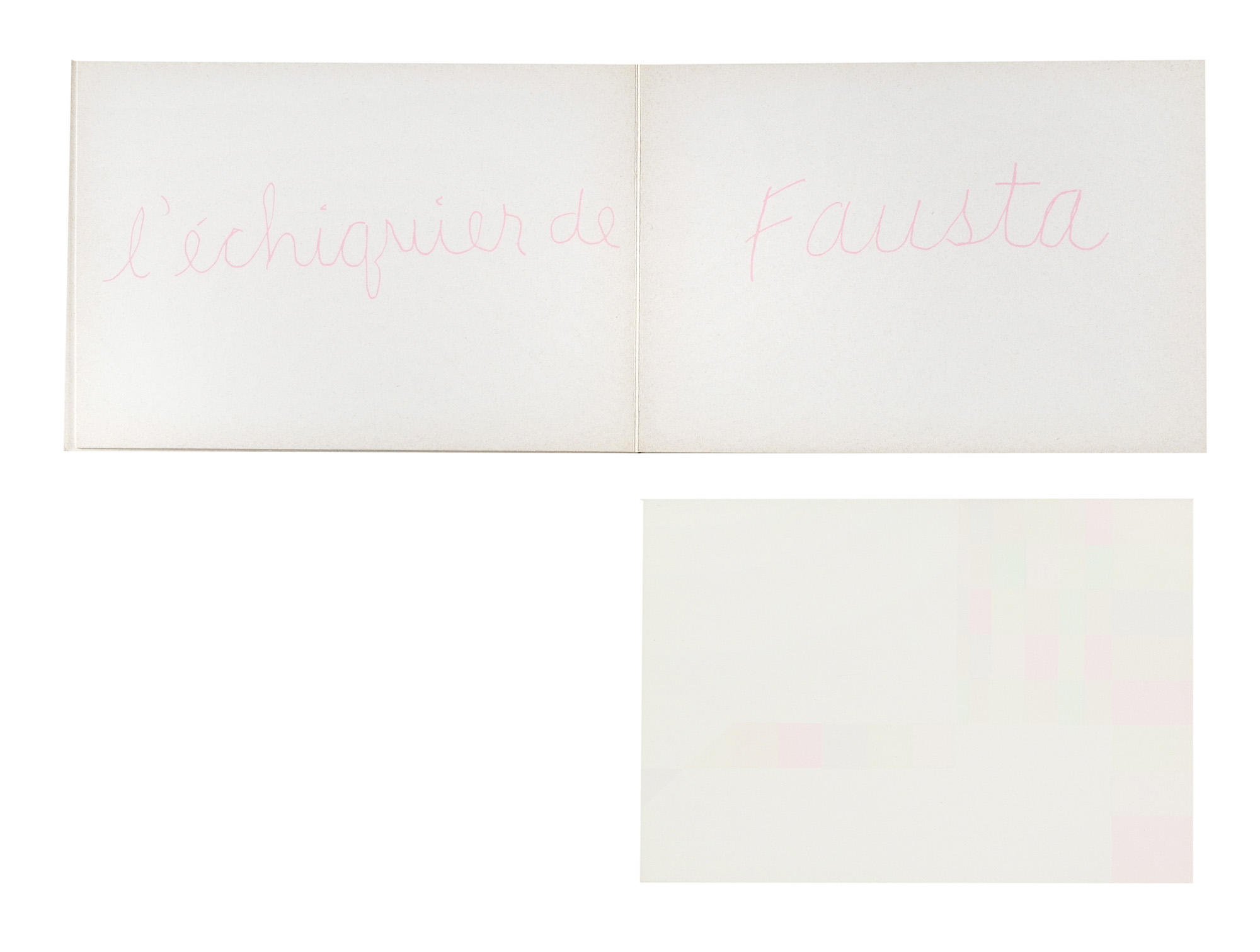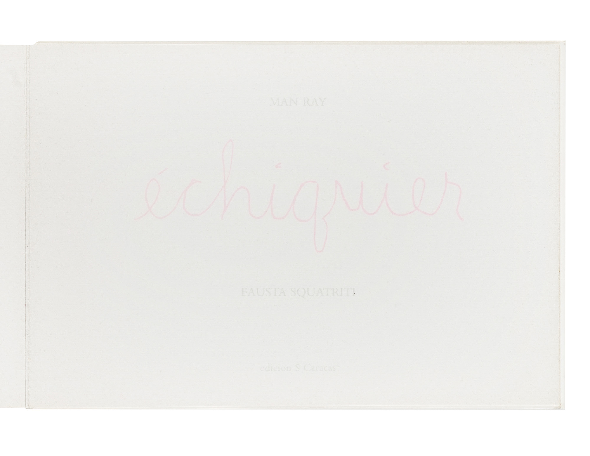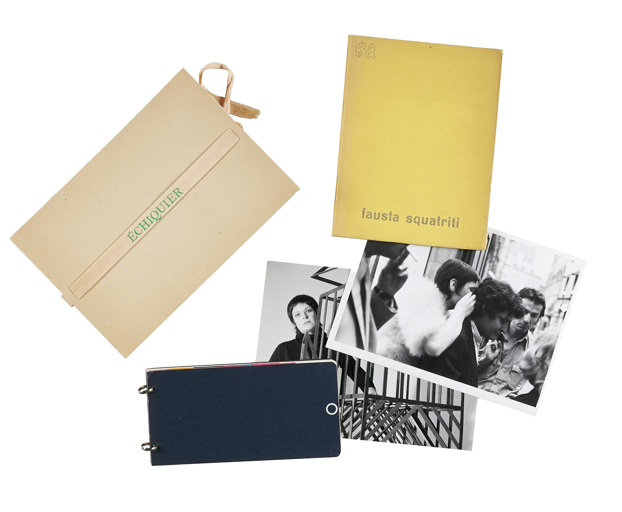 Compongono il lotto: 1) Squatriti Fausta, The cloud eye. Milano: Sergio Tosi, 1969; 2) Fausta Squatriti. Exp. 71. Cat. 36. Julio 71. Milano: Locatelli, 1971; 3) Ray Man, Echiquier. Fausta Squatriti. Milano: Edicion S. Caracas, 1975; 4-5) Due fotografie in bianco e nero (mm 180x236), senza timbro. (5) III OPERA: Bel libro d'artista illustrato con varie composizioni calligrafiche di Man Ray stampate a colori tra le pagine, a cui sono allegate 10 litografie a colori, sciolte, firmate e numerate da Fausta Squatriti. Tiratura in 75 esemplari, numerati e firmati al colophon.