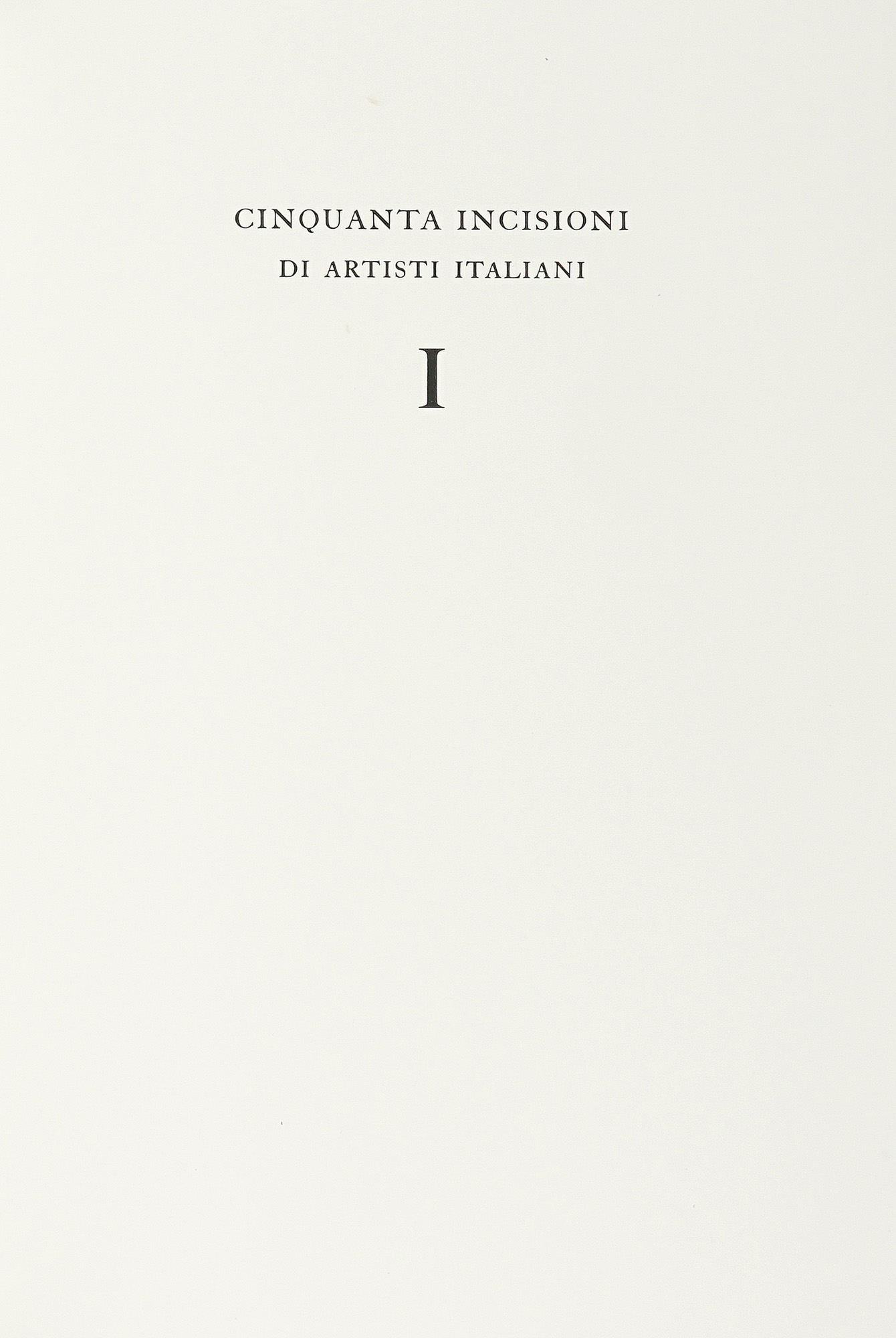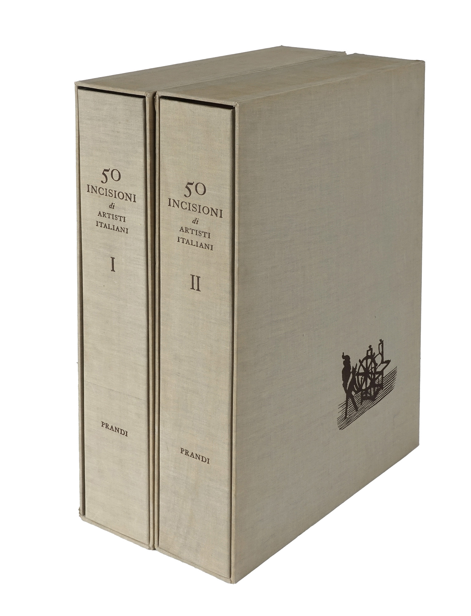 2 cartelle in-folio (mm 500x350) in tela e con astuccio editoriale. Le 50 incisioni originali, numerate e firmate a matita dagli artisti, sono inserite, sciolte, in eleganti passe-partout di cartoncino grigio, con carta di protezione. Gli artisti presenti con una loro opera originale sono: Giuseppe Ajmone, Ugo Attardi, Giovanni Barbisan, Luigi Bartolini, Arnaldo Battistoni, Giovanni Brancaccio, Renzo Bruscaglia, Domenico Cantatore, Carlo Carrà, Felice Casorati, Francesco Casorati Pavarolo, Bruno Cassinari, Leonardo Castellani, Vincenzo Ciardo, Arnoldo Ciarrocchi, Italo Cremona, Fiorella Diamantini, Enzo Faraoni, Pericle Fazzini, Franco Gentilini, Giuseppe Guerreschi, Virgilio Guidi, Nunzio Gulino, Renato Guttuso, Mario Lattes, Diana Luise, Mino Maccari, Raffaella Magliola, Cesco Magnolato, Paolo Manaresi, Alberto Manfredi, Carlo Mattioli, Sante Monachesi, Giselda Parisella, Errico Paulucci, Arturo Perez, Armando Pizzinato, Franco Rognoni, Giovanni Romagnoli, Duilio Rossoni, Bruno Saetti, Aldo Salvadori, Aligi Sassu, Nunzio Scavarrello, Ardengo Soffici, Orfeo Tamburi, Ernesto Treccani, Renzo Vespignani, Tono Zancanaro, Alberto Ziveri. Testo di Marco Valsecchi in bifogli in barbe. Macchi e tracce d'uso ai cofanetti, altrimenti ottima copia. Uno dei 75 esemplari numerati, su una tiratura complessiva di 80 copie. (2) Il testo e le incisioni, stampate sotto la direzione di Alberto Manfredi, sono su carta a mano Magnani di Pescia, appositamente fabbricata. Insieme a quella successiva di un anno, realizzata dalla stamperia fiorentina de "Il Bisonte", è questa la più importante edizione di grafica incisa del Novecento italiano. F. Dall'Aglio (I Prandi, Milano, Scheiwiller, 1987) nn. 164-213, pp. 127-139.