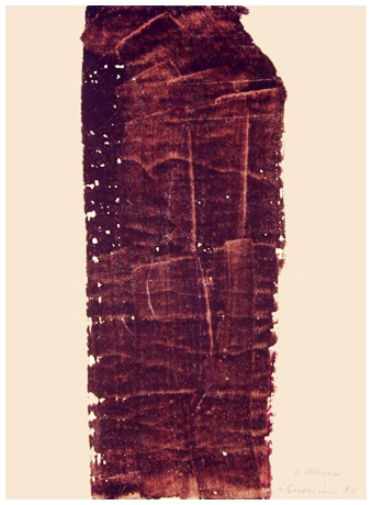 MINO GUERRINI Roma 1927 – Rimini 1990 Senza titolo 1982 Pittura su carta da parati 36 x 26,5. Dedica, firma e data in b. a d.; sul pannello di chiusura etichetta di collezione privata + timbro galleria Dragon Fly Arte, Roma.
