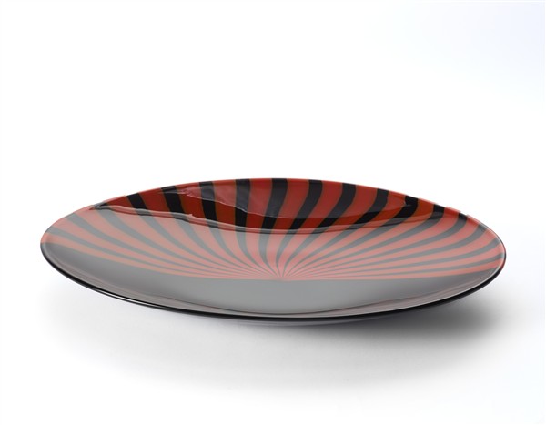 Lino Tagliapietra Centrotavola in vetro incamiciato nero a canne color corallo.