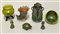 Lotto composto da vaso in ceramica e lamina d'argento Jugendstil, due vasetti in vetro iridescente di cui uno a forma di cornucopia, uno svuotatasche e tre animali in ceramica della manifattura Zsolnay. Secolo XX. (h max cm 16) (difetti)