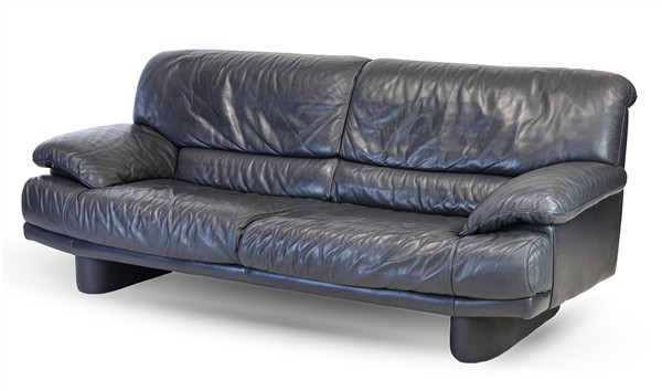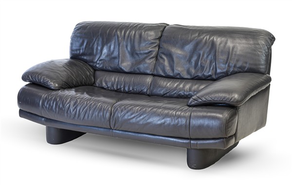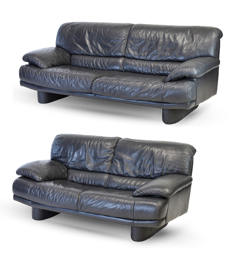 Due divani a due posti in pelle grigia. Italia, anni '90. (cm 206x84x90) (difetti)