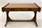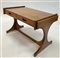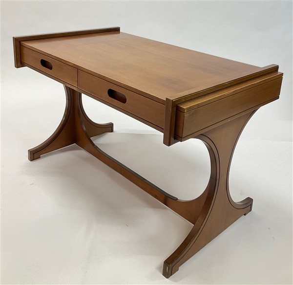 Scrivania in legno impiallacciato, due cassetti nella fascia, gambe sagomate. I