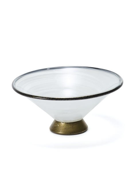 Coppa. Murano, anni '90/2000. Vetro soffiato opalescente con morise, base e collarini applicati a caldo in pasta vitrea nera con applicazione di foglia d'oro. (h cm 12, d cm 26)