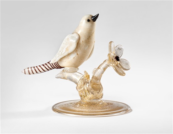 Ercole Barovier Scultura raffigurante uccellino su ramo in vetro soffiato crista