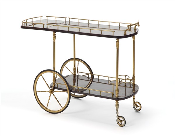 * Carrellino bar. Lazzate, anni '50. Legno rivestito di pergamena colorata e verniciata al poliestere, ruote in metallo dorato, guarnizioni in ottone e metallo dorato. (cm 111x76x43) (lievi difetti)