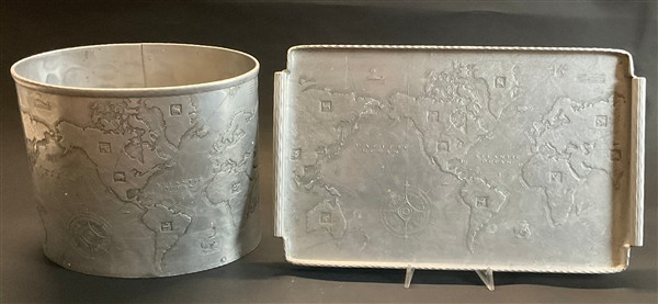 Lotto composto da un vassoio e una glacette in alluminio martellato a rilievo raffigurante carta geografica. USA, anni '20/'30. (l max cm 46)