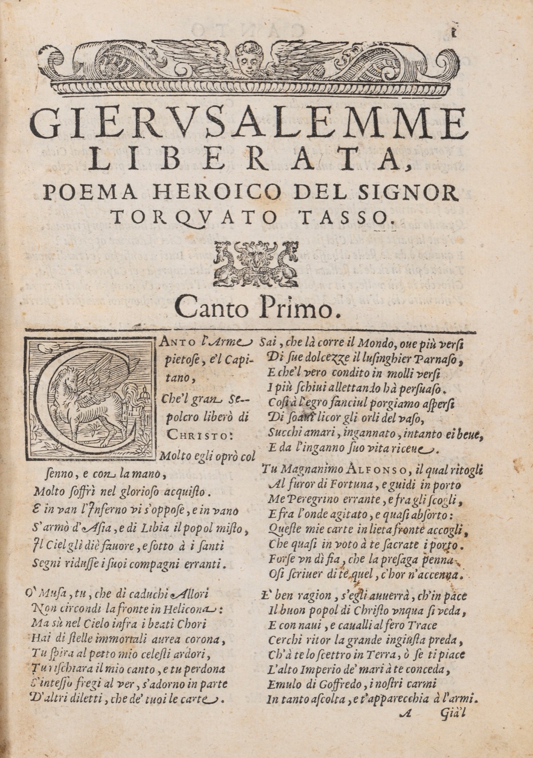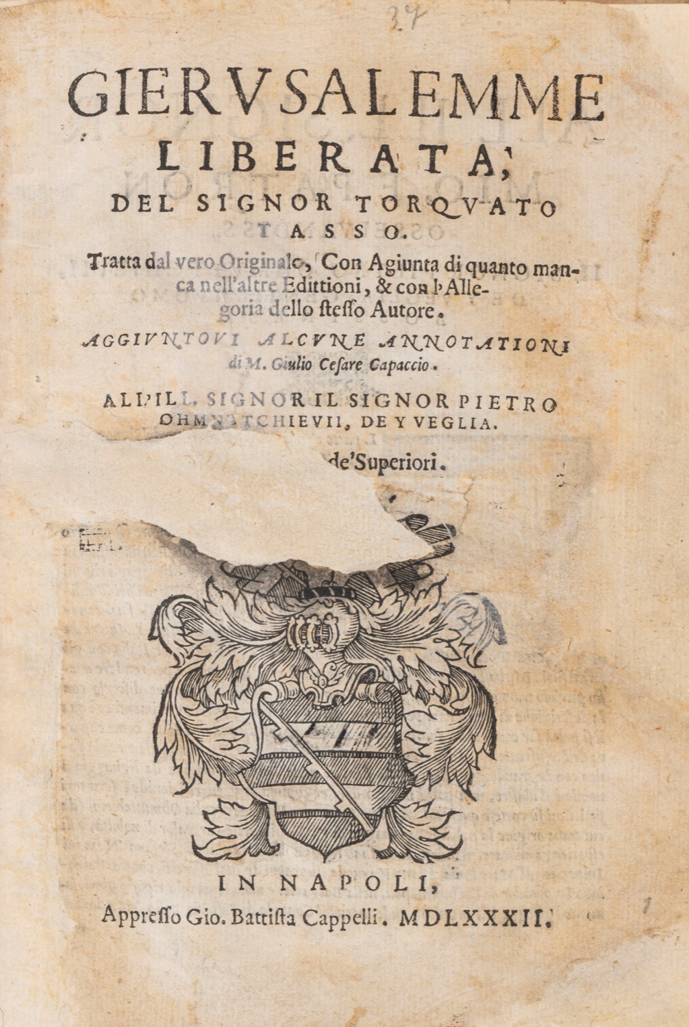 Lot 14 | Torquato Tasso - Gierusalemme liberata, del signor Torquato Tasso; tratta dal vero originale, con agiunta di quanto manca nell'altre edittioni, & con l'allegoria dello stesso autore., 1582