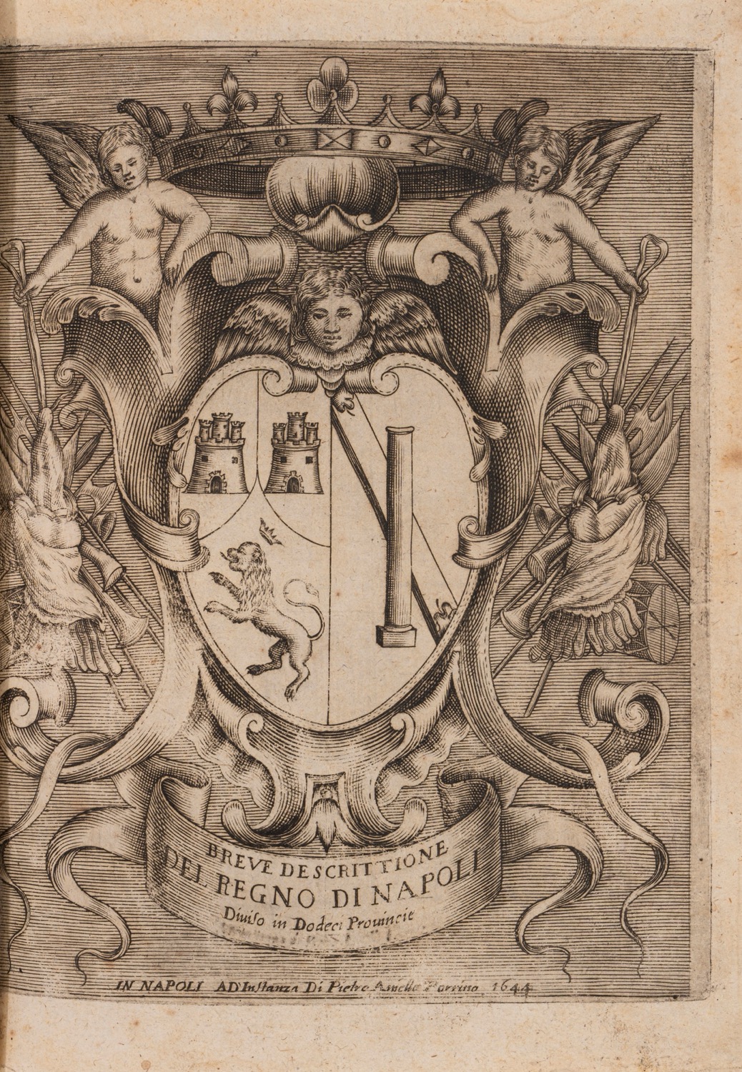 Napoli, per Ottaviano Beltrano (ad instanza di Pietro Aniello Parrino), 1644. In 4°. Elegante antiporta allegorica riccamente decorata, stemma al frontespizio, armi nobiliari nel testo, bruniture e fioriture, altrimenti ottimo esemplare, legatura in mezza pelle marrone e cartone spugnato rosa del sec.XVIII, tagli a spruzzo blu.Napoli, per Ottaviano Beltrano (ad instanza di Pietro Aniello Parrino), 1644. In 4°. Elegante antiporta allegorica riccamente decorata, stemma al frontespizio, armi nobiliari nel testo, bruniture e fioriture, altrimenti ottimo esemplare, legatura in mezza pelle marrone e cartone spugnato rosa del sec.XVIII, tagli a spruzzo blu.