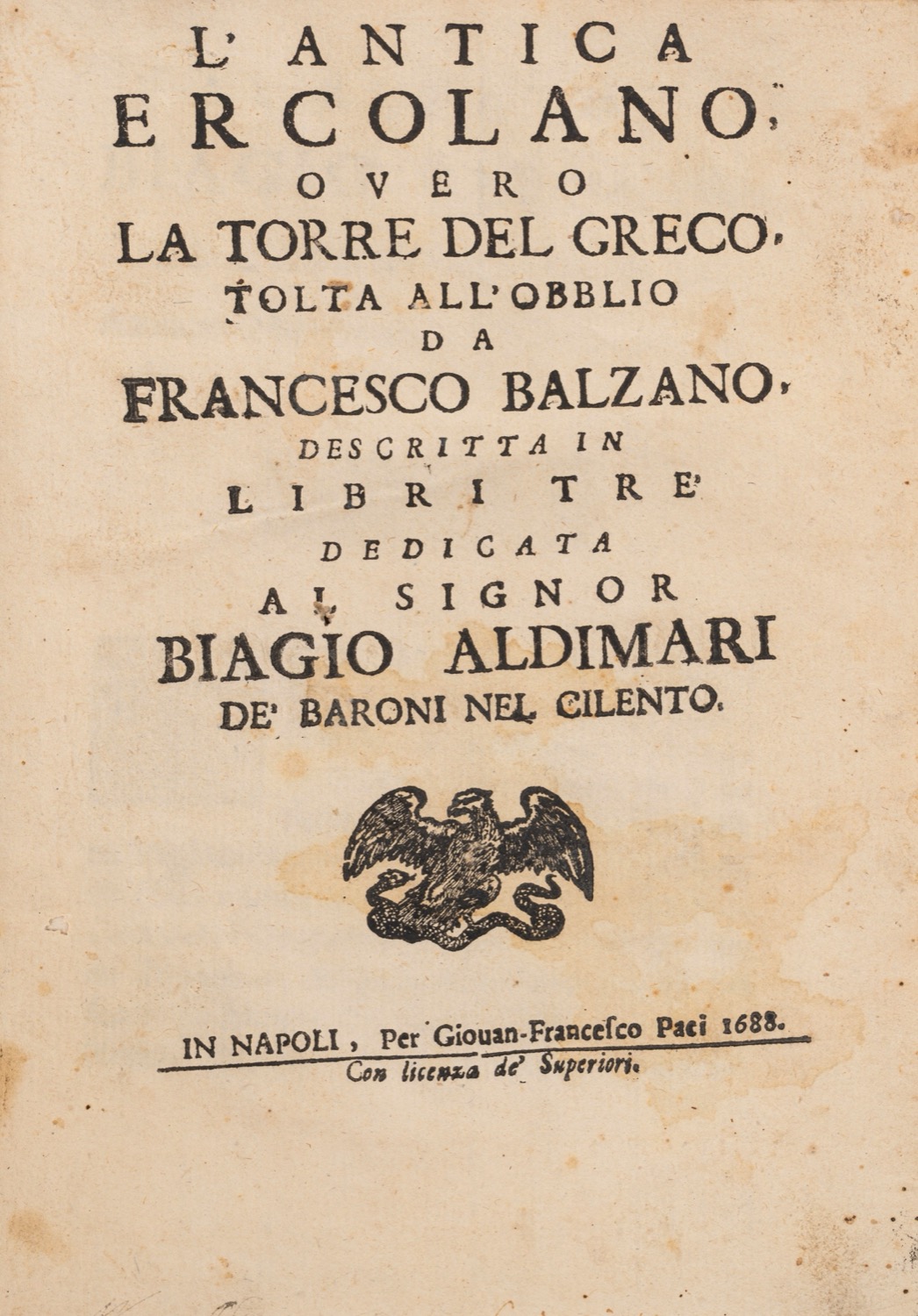 Lot 21 | Francesco Balzano - L'Antica Ercolano overo la Torre del Greco tolta all'obblio, 1688