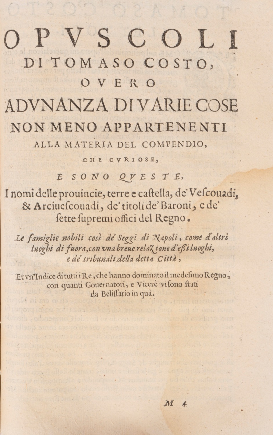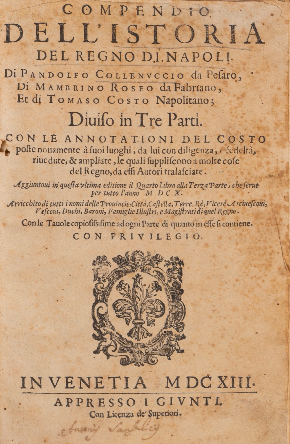 Venezia, i Giunti, 1613. In 4°. 3 parti in un vol. Marca tipografica al frontespizio, iniziali incise in legno, carta M4r, con proprio occhietto: Opuscoli di Tomaso Costo, overo adunanza di varie cose non meno appartenenti alla materia del compendio, che curiose, e sono queste, i nomi delle prouincie, terre e castella, de' vescouadi, & arciuescouadi, de' titoli de' baroni, e de' sette supremi offici del regno, esemplare molto rifilato al margine superiore, qualche lieve fora d'acqua, legatura moderna in mezza pelle con angoli, titoli impressi in oro al dorso con fregi in oro e a secco.Venezia, i Giunti, 1613. In 4°. 3 parti in un vol. Marca tipografica al frontespizio, iniziali incise in legno, carta M4r, con proprio occhietto: Opuscoli di Tomaso Costo, overo adunanza di varie cose non meno appartenenti alla materia del compendio, che curiose, e sono queste, i nomi delle prouincie, terre e castella, de' vescouadi, & arciuescouadi, de' titoli de' baroni, e de' sette supremi offici del regno, esemplare molto rifilato al margine superiore, qualche lieve fora d'acqua, legatura moderna in mezza pelle con angoli, titoli impressi in oro al dorso con fregi in oro e a secco.