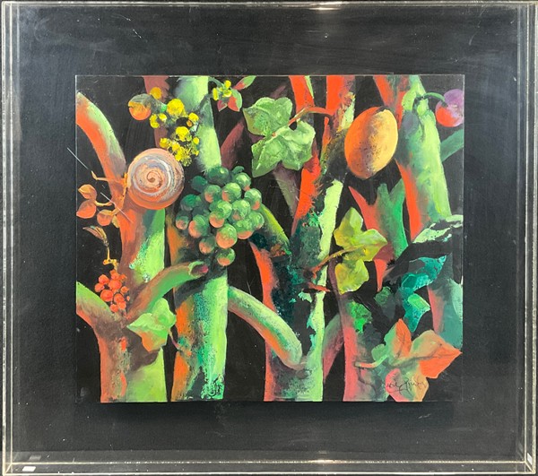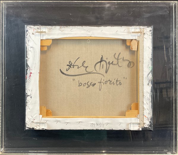firmato in basso a destra; titolato e firmato al retro. In cornice di plexiglass (lievi difetti)