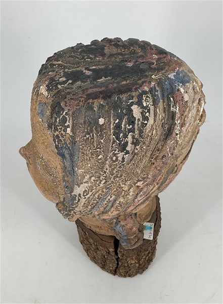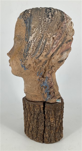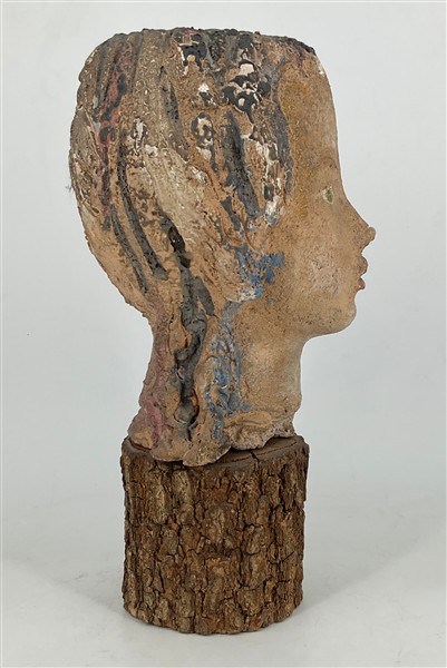 Mario Porcu "Volto femminile" scultura in terracotta dipinta su base in legno h