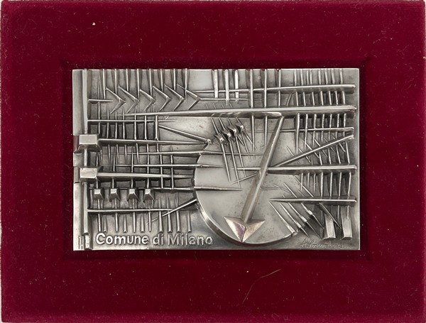 Lot 2352 | Arnaldo Pomodoro "Targa per Comune di Milano" 1978 bronzo argentato cm 8x11,5 fi