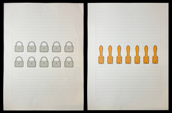 Tino Stefanoni "Pennelli" e "Lucchetti" due litografie a colori cm 69,5x50 firm