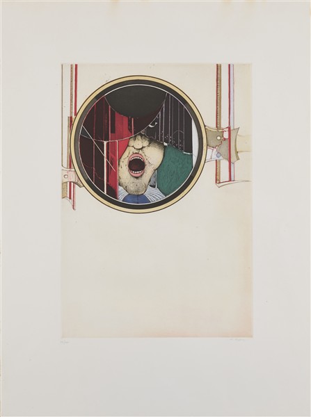 Karl Plattner "Retrovisione (Rückschau)" 1980 acquaforte e acquatinta a colori (