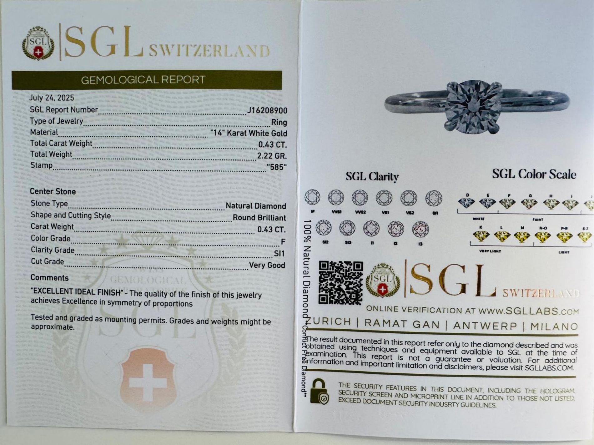 Anello in Oro bianco 14K Peso: 2,22 grammi Tipo di Pietra: Diamante naturale Peso Totale Diamante: 0,43 carati Colore Pietra: F Purezza Pietra: SI1 Misura: 56 Design: Anello a fascia con montatura a griffe, dal design semplice ed elegante Dettagli: Perfetto per un look raffinato, con un diamante di alta qualità che dona brillantezza naturale RNG50704 - COMMISSIONE D’ASTA 25%