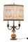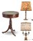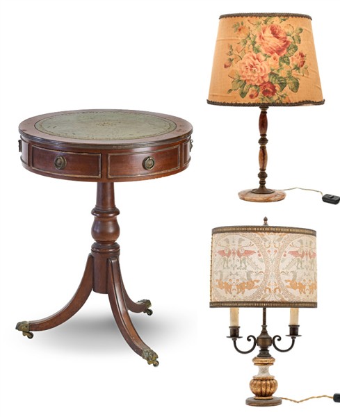 Lotto composto da un tavolino inglese in mogano con piano circolare, due tiretti e due finti titretti nella fascia, sostegno su tripode (d cm 50, h 65) e due lampade da tavolo di diversa forma con paralume (difetti)