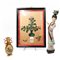 Lotto composto da un pannello decorato in pietre dure raffigurante vaso fiorito e iscrizione, in cornice (cm 35,5x26,5), un vasetto in metallo con placche in osso scolpito (h cm 15) e una figura in metallo e smalti cloisonnè con parti in bachelite (h cm 34) (difetti)
