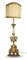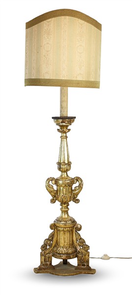 Candeliere in legno intagliato e dorato a mecca con fusto a vaso biansato su tripode. Secolo XVIII (h cm 98) adattato a luce elettrica con paralume in epoca successiva (h tot cm 166) (difetti)