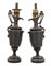 Coppia di basi per lamapada in metallo brunito a forma di anfora con decorazioni incise a volute e figure allegoriche a rilievo, basi circolari in marmo nero e verde. Fine secolo XIX (h cm 48) (difetti e restauri)