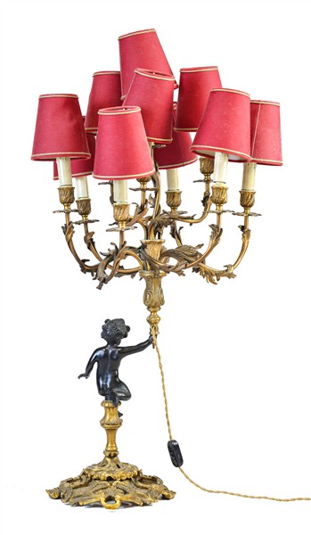 Lampada da tavolo in metallo brunito e dorato a guisa di candelabro a dieci bracci mossi con decori fogliacei, sostegno a putto su base rocaille (h tot cm 90) (difetti)