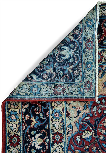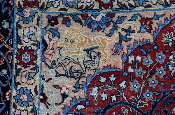 Tappeto preghiera Sarouk, Persia, inizio secolo XX. Mirab a fondo rosso decorato con Albero della Vita ornato da rami fioriti ed una griglia di volute e girali con gigli di ispirazione Safavide. Ai due angolari superiori una scena di caccia realizzata specularmente. Bordura principale Herati su fondo blu notte, tra due bordure a meandro su fondo bianco (cm 262x163) (difetti e rapature)