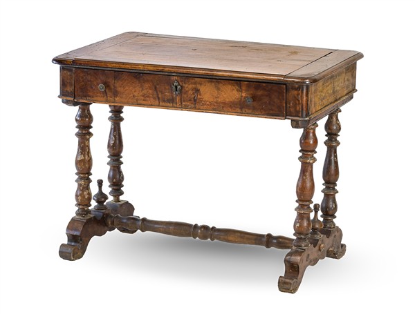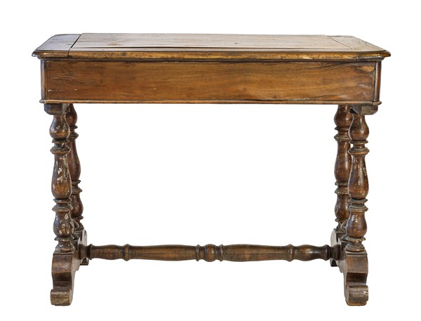Piccolo scrittoio ad un cassetto nella fascia e piano scorrevole, montanti torniti riuniti da traversa poggianti su piedi sagomati. Secolo XIX (cm 98x76x60) (gravi difetti)