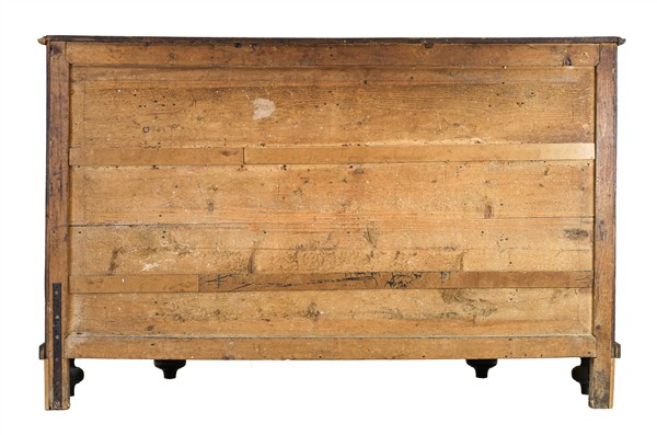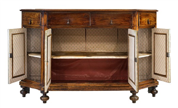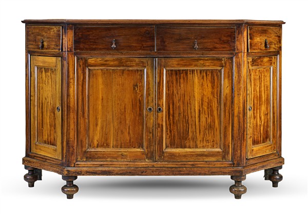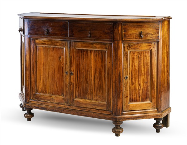 Credenza scantonata in legni vari a quattro cassetti e quattro ante pannellate, piedi torniti a cipolla. Veneto, inizio secolo XIX (cm 183x116x61) (difetti e restauri)