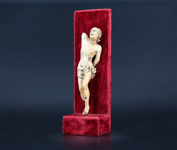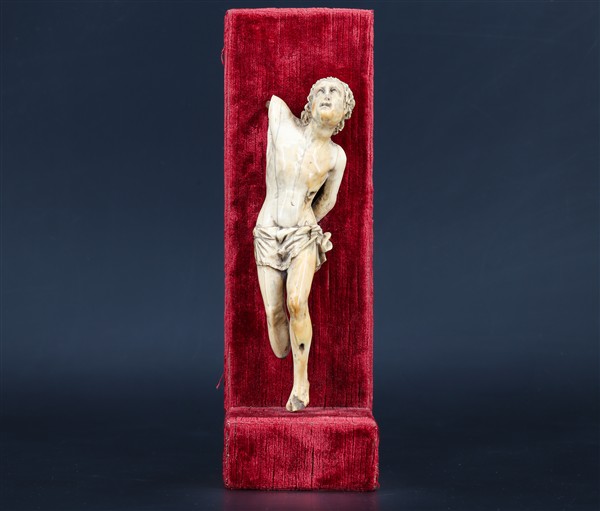Scultore del secolo XVI. San Sebastiano in avorio scolpito (h cm 16) montato su base lignea con rivestimento in velluto d'epoca successiva (difetti e mancanze)