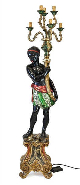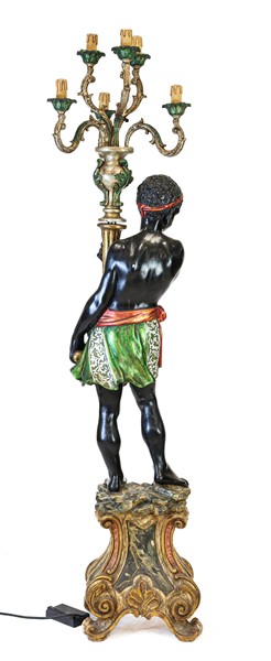 Moretto reggitorcia in legno e pastiglia ebanizzata, dipinto in policromia e dorato a mecca. Raffigurato con cornucopia da cui dipartono sei bracci elettrificati su base sagomata (h tot cm 172) (difetti)